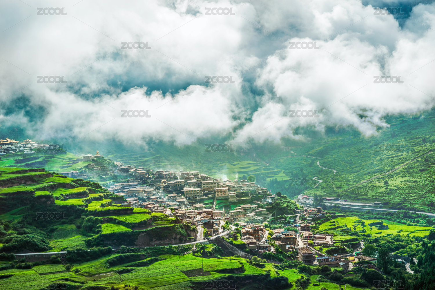 草原,生态,云雾,早晨,居民,山脉,农田,作物,居住点,新村
