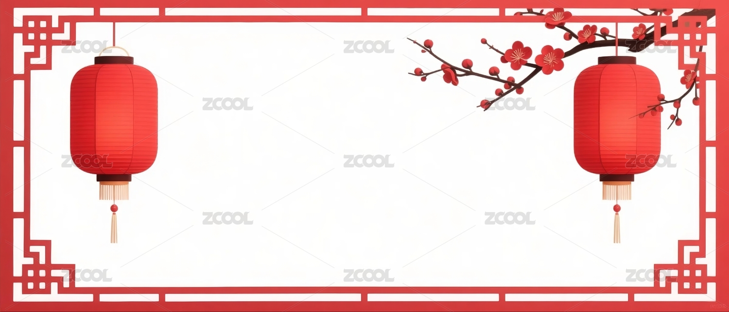 带有中国传统花窗和灯笼图案的春节喜庆海报