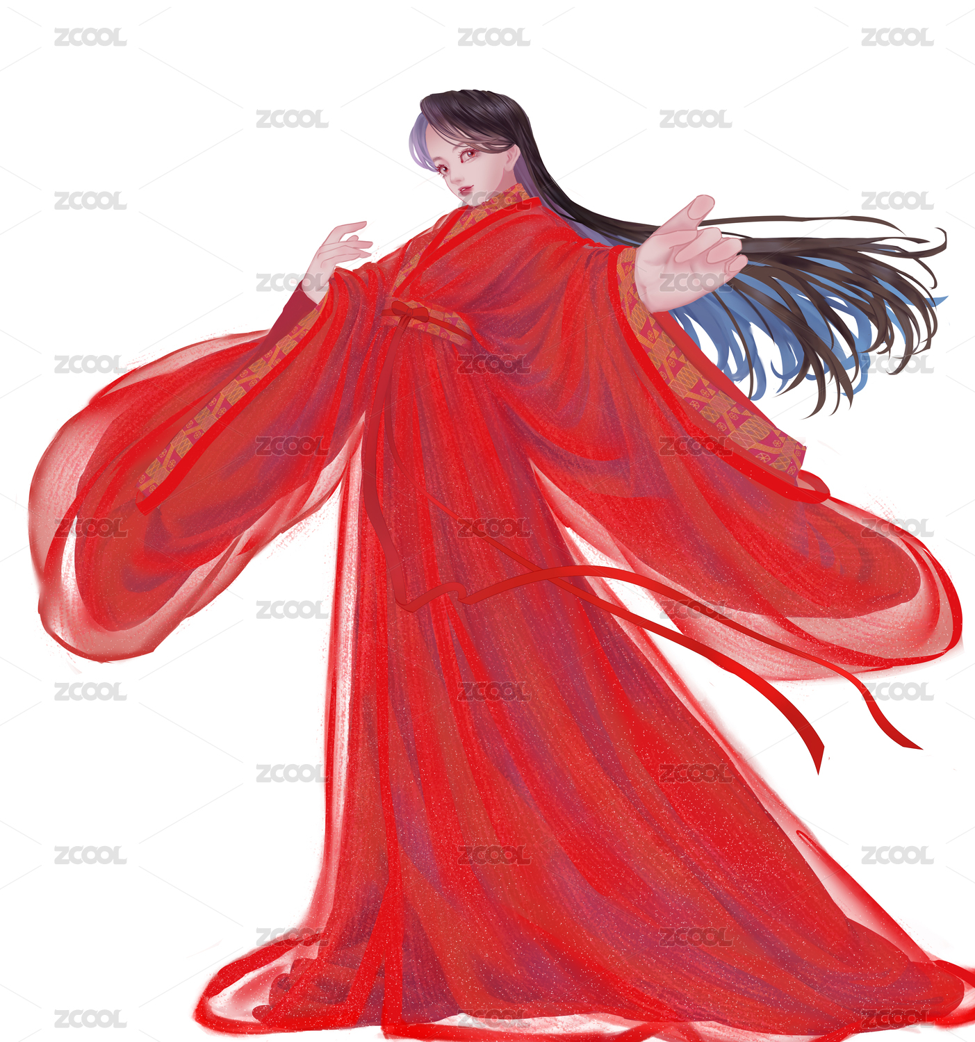 穿着红色薄纱战国袍头发飘起的汉服女人