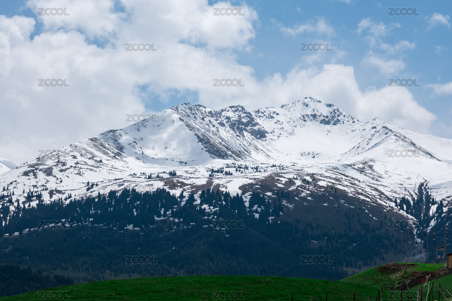 六月,中国新疆恰西草原上瞭望远处的雪山