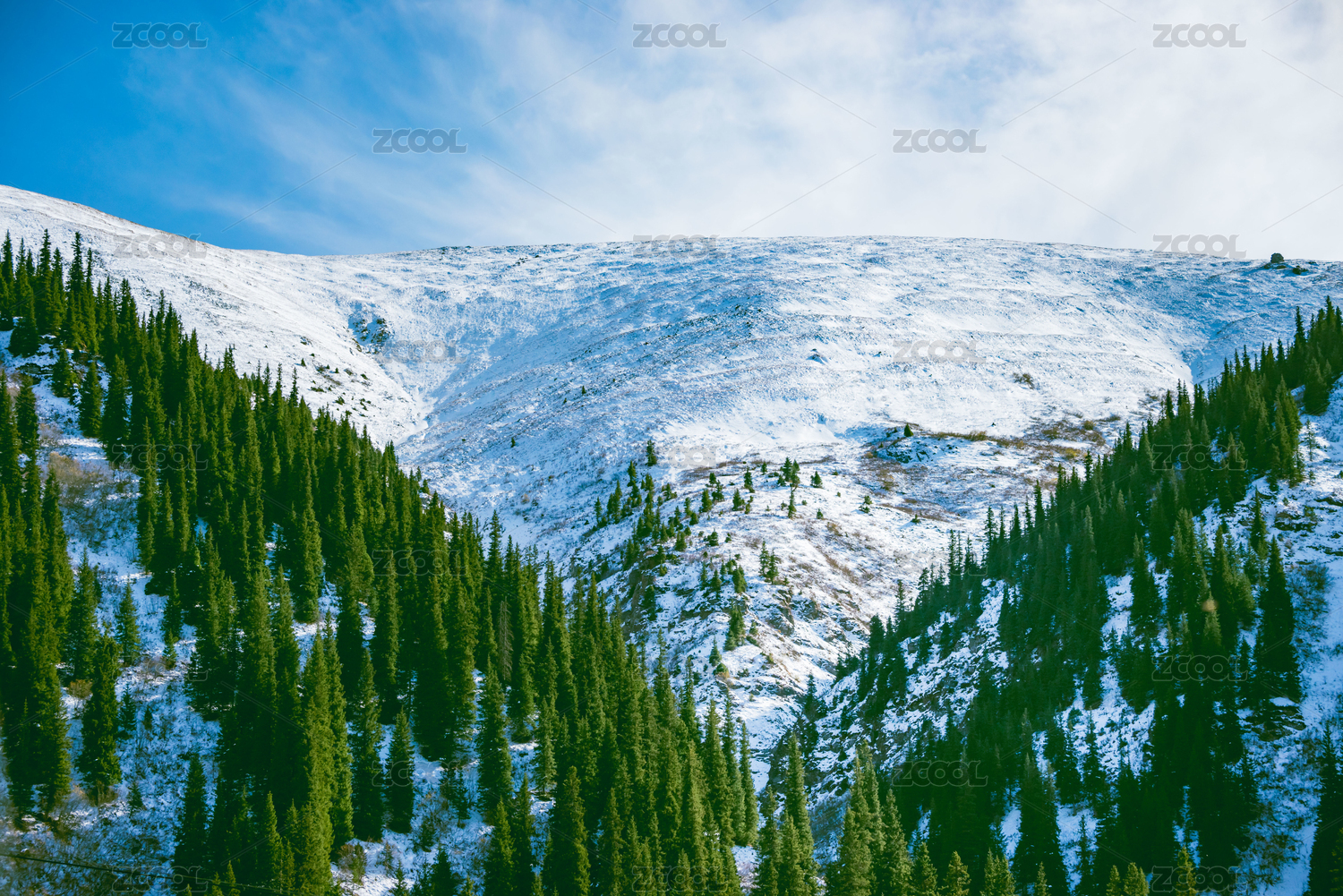 中国新疆天山山脉冬季的雪山和云杉林