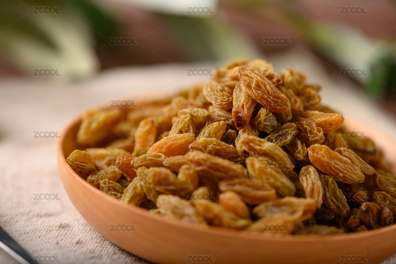 桌面上的木纹盘子里面的提子干