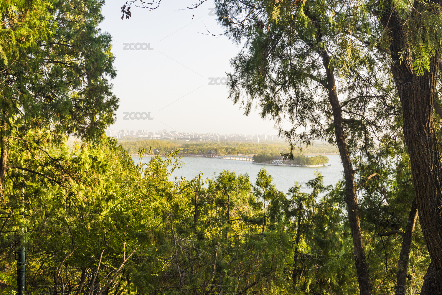 秋天在北京颐和园公园的树林远眺昆明湖的十七孔桥