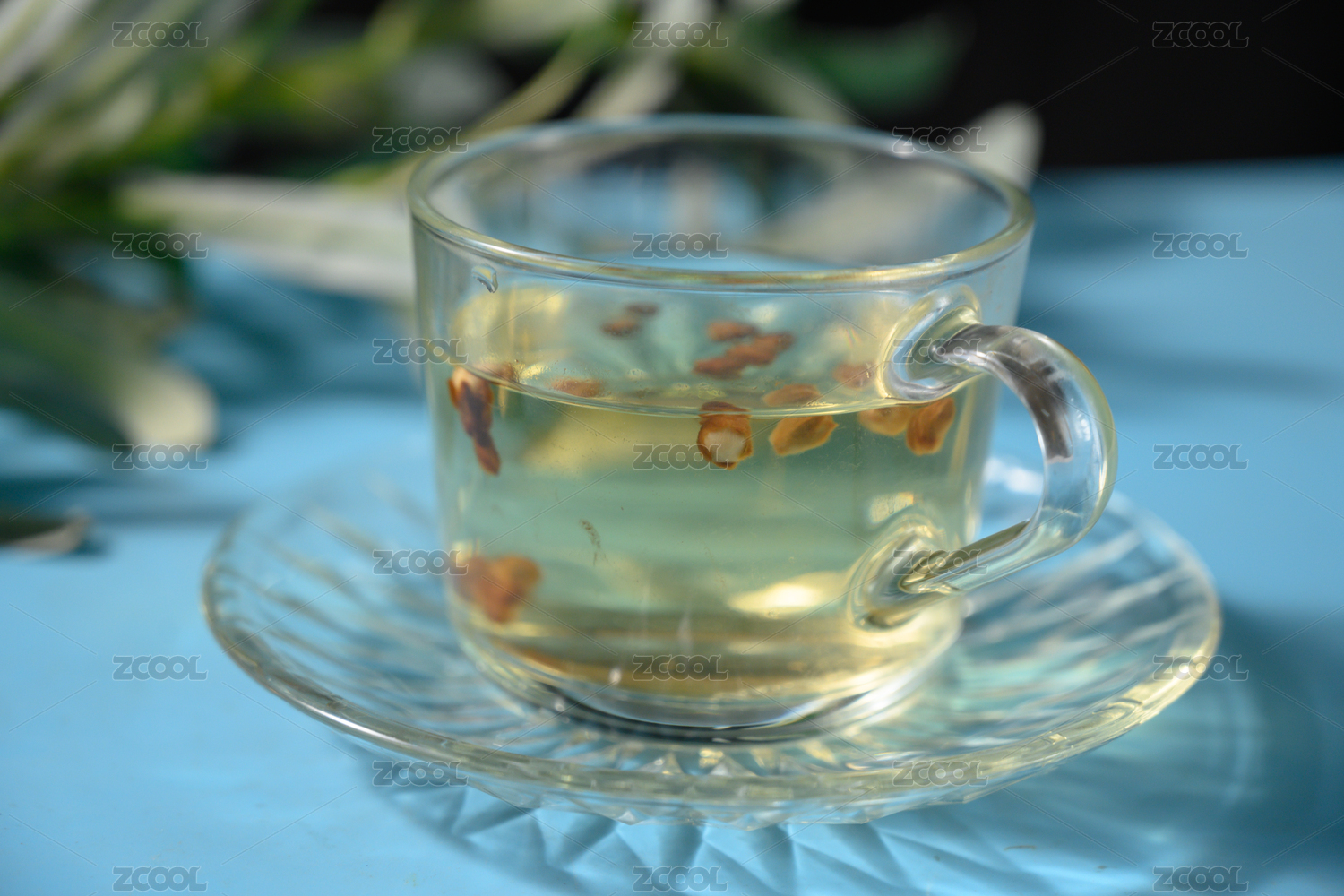 桌面上的杯子里的甘甜可口的辣木籽茶