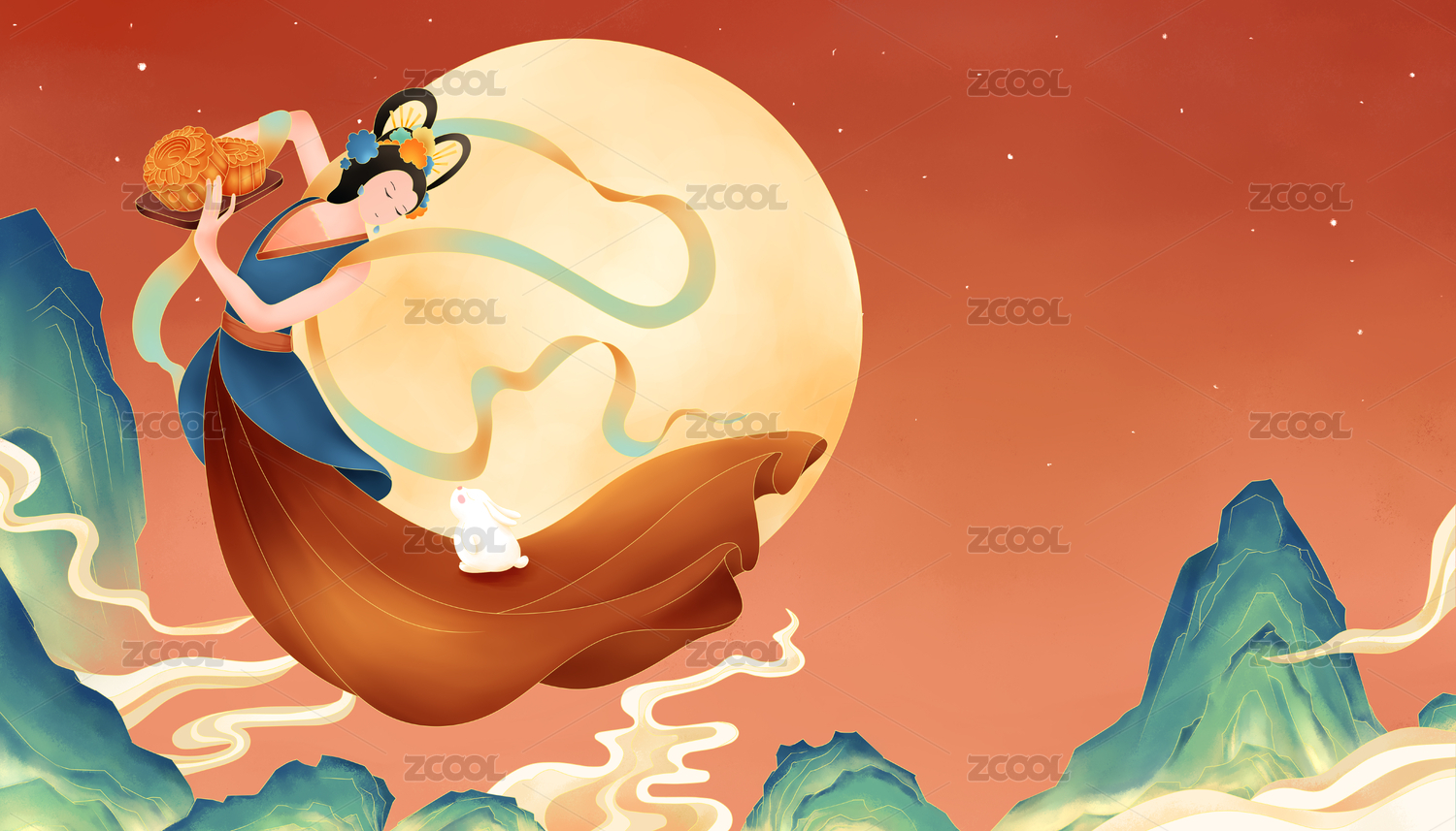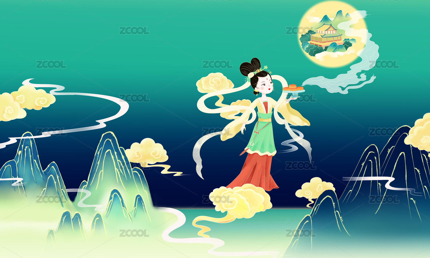 中秋节飞天仙女嫦娥奔月中国风插画背景