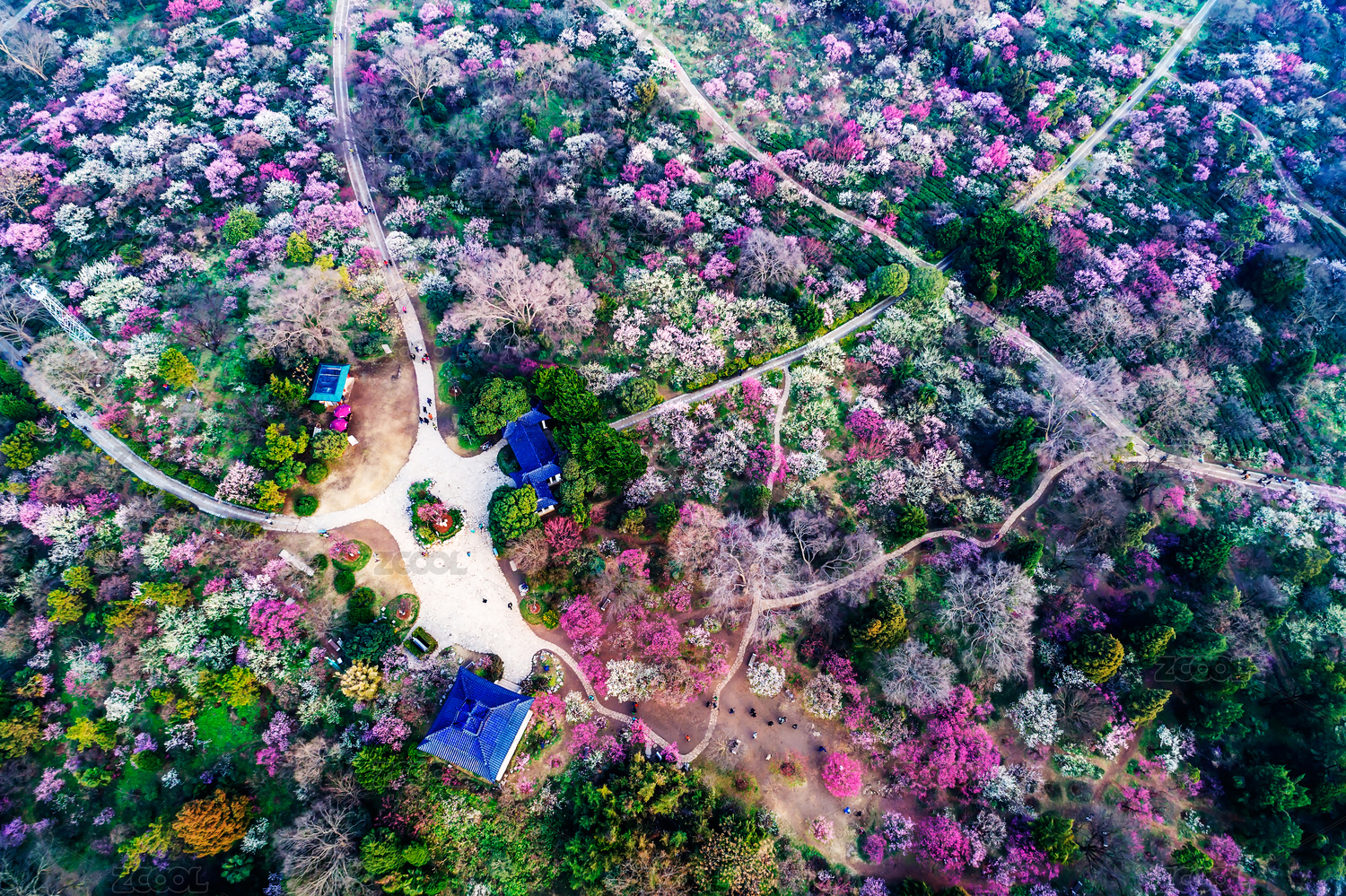 航拍江苏省南京玄武区明孝陵景区梅花山春景