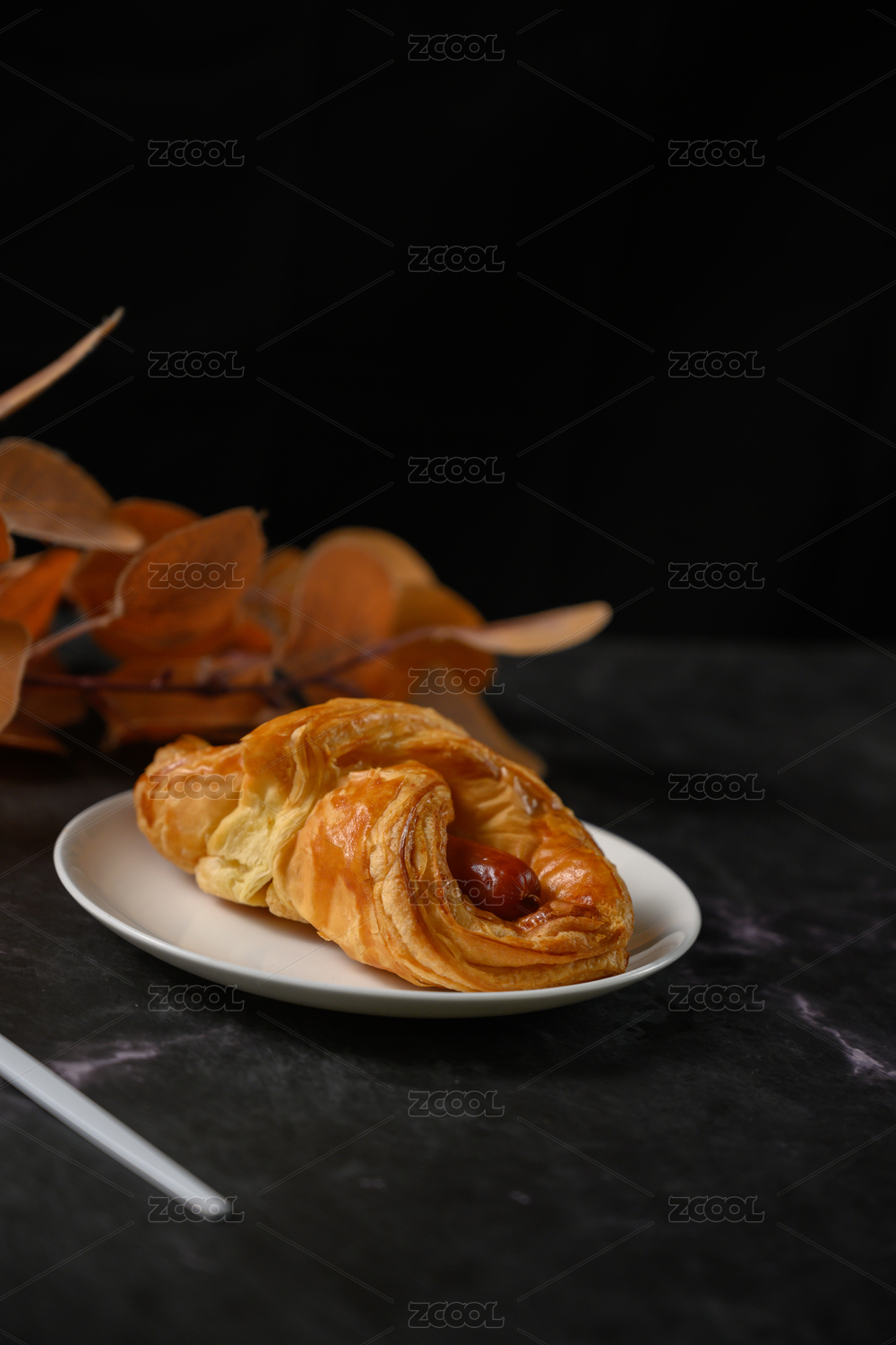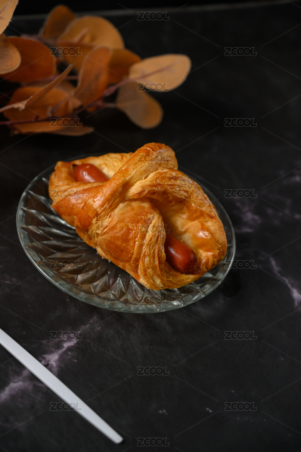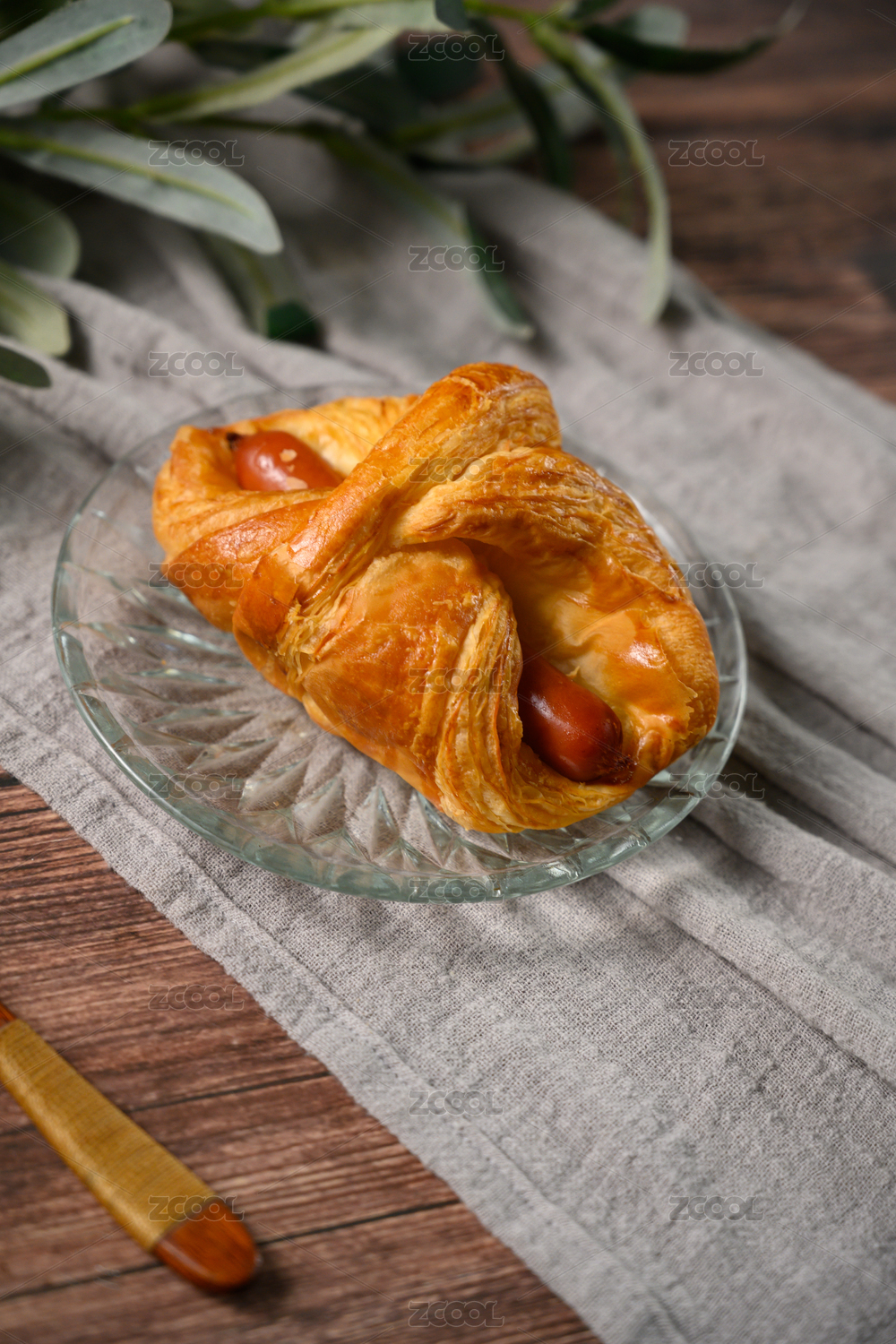 桌面上的盘子里的美味可口的丹麦肠仔包