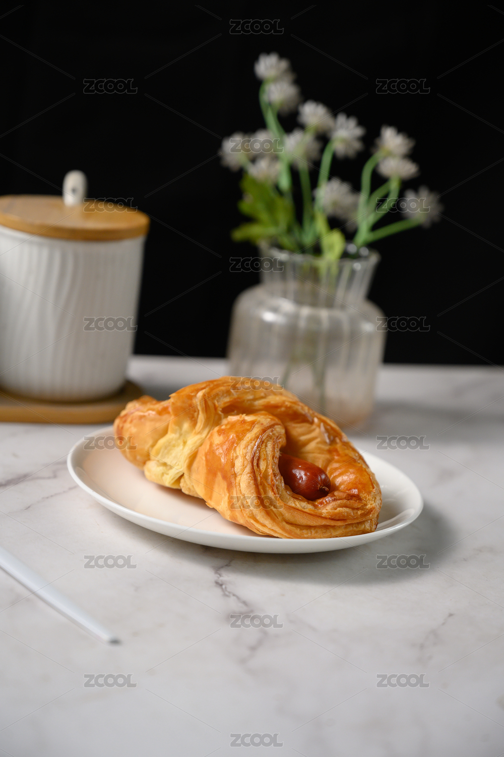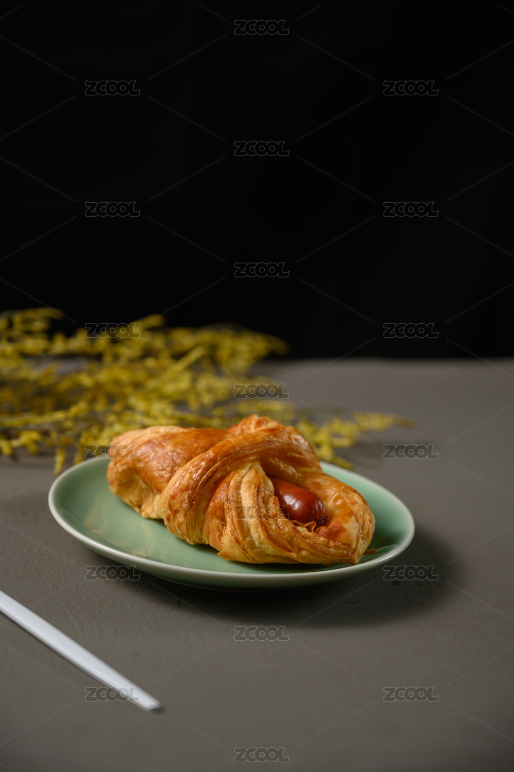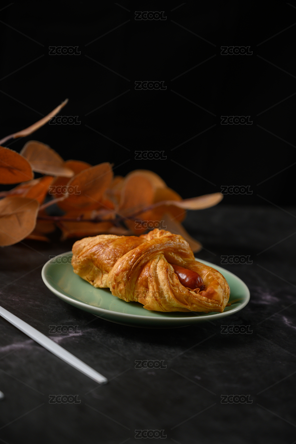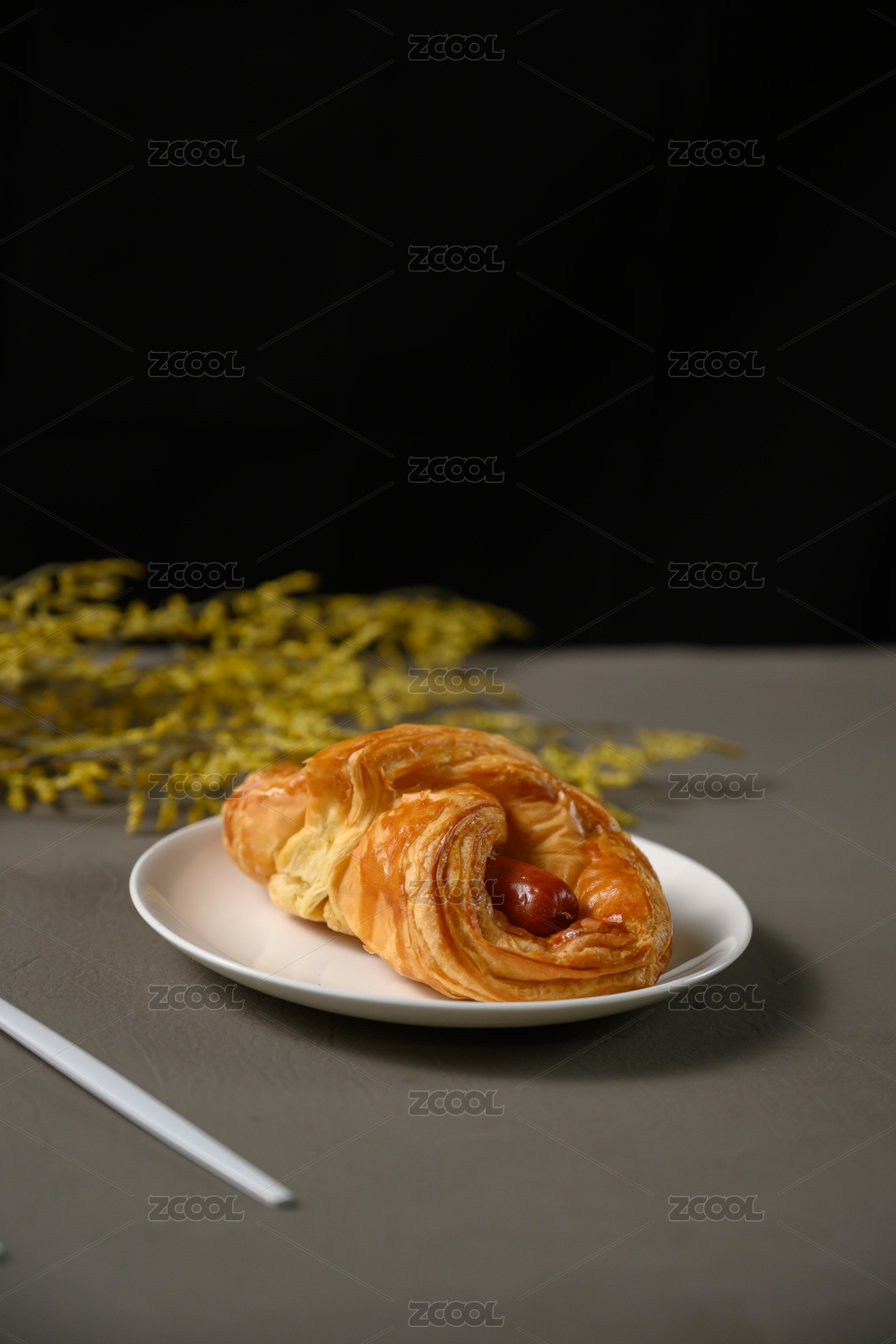 桌面上的盘子里的美味可口的丹麦肠仔包