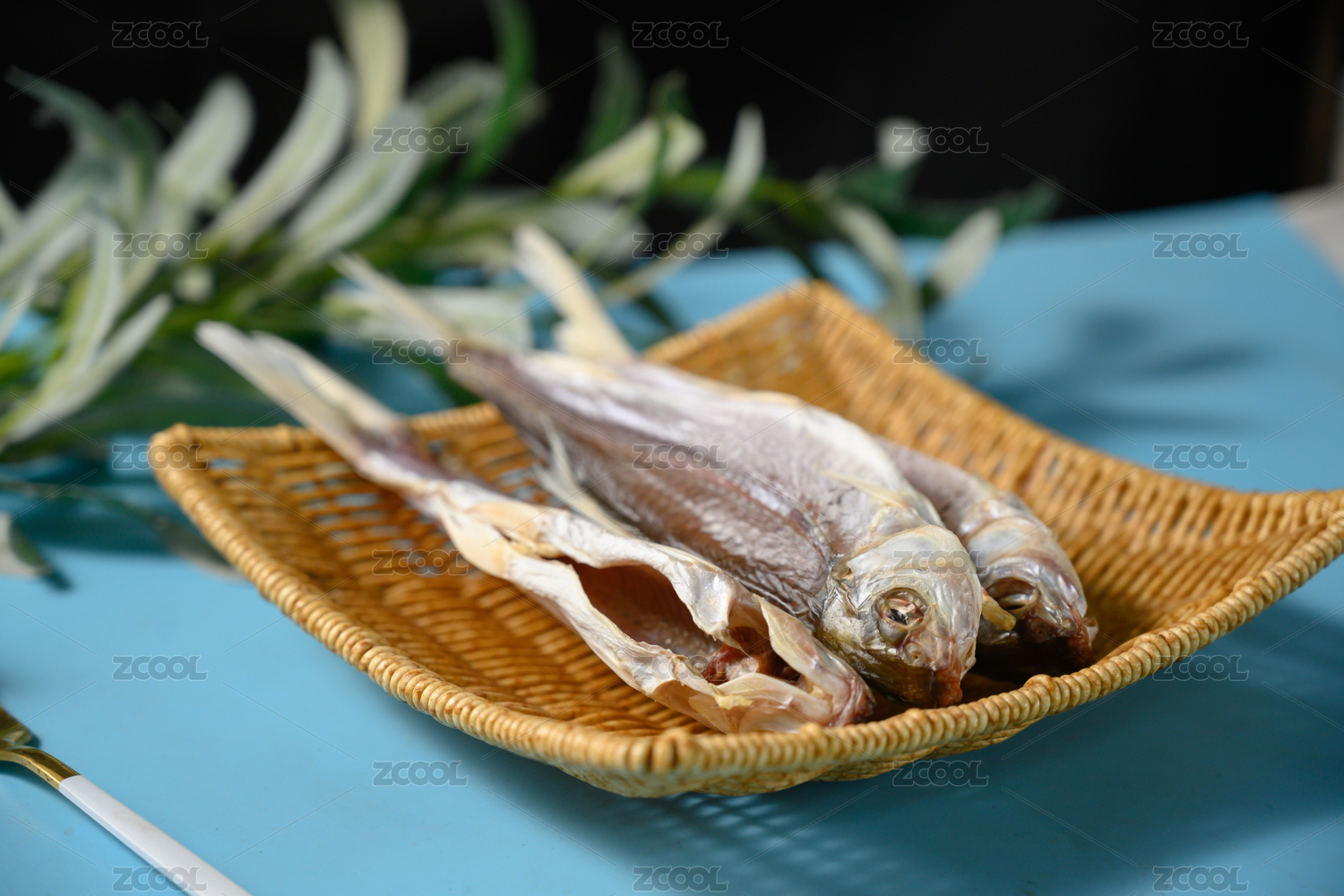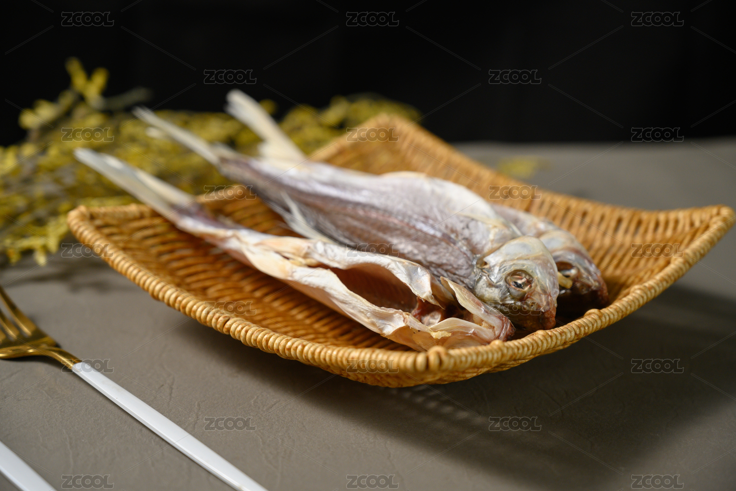 桌面上的盘子里的美味可口的鱼干
