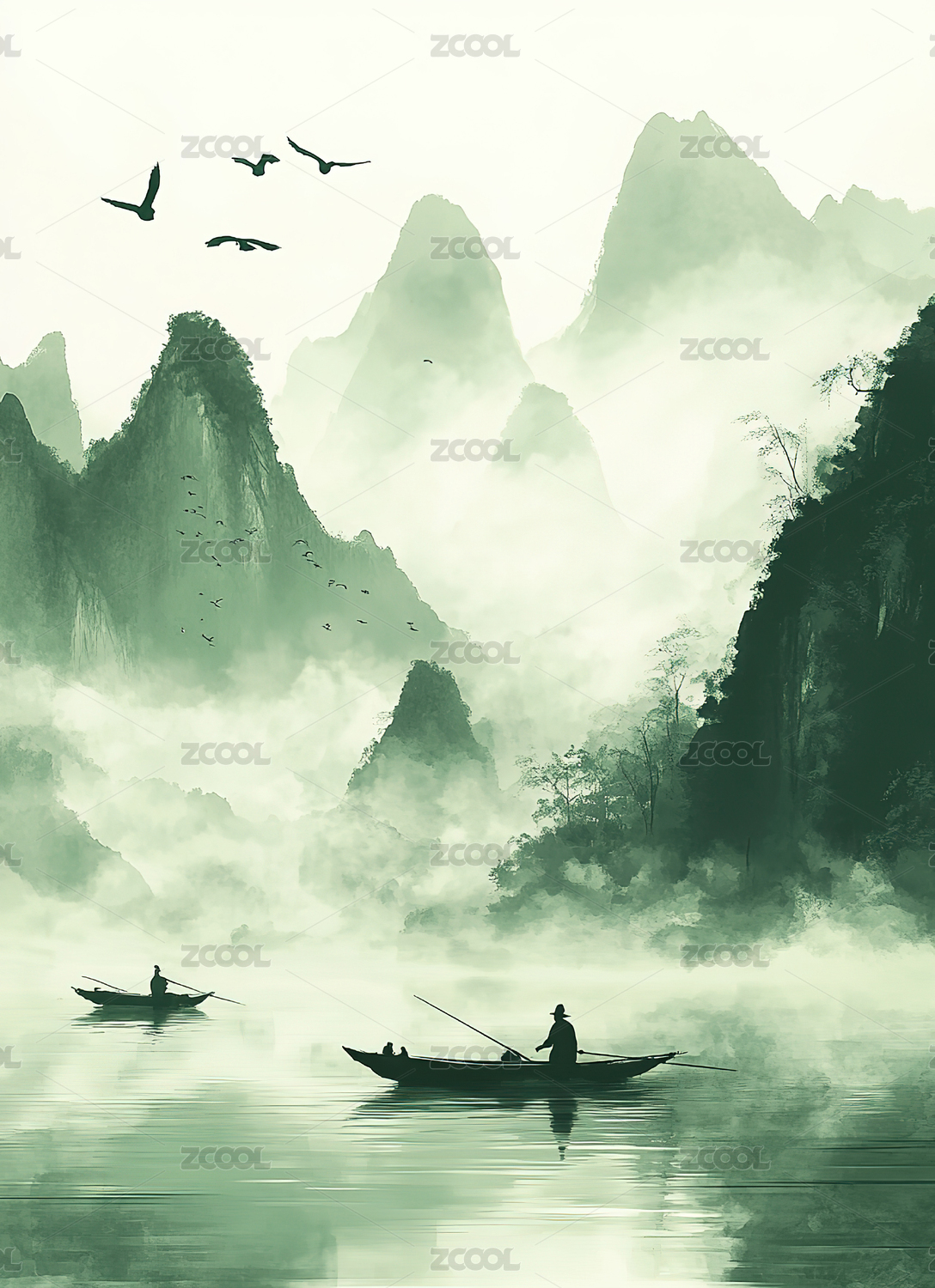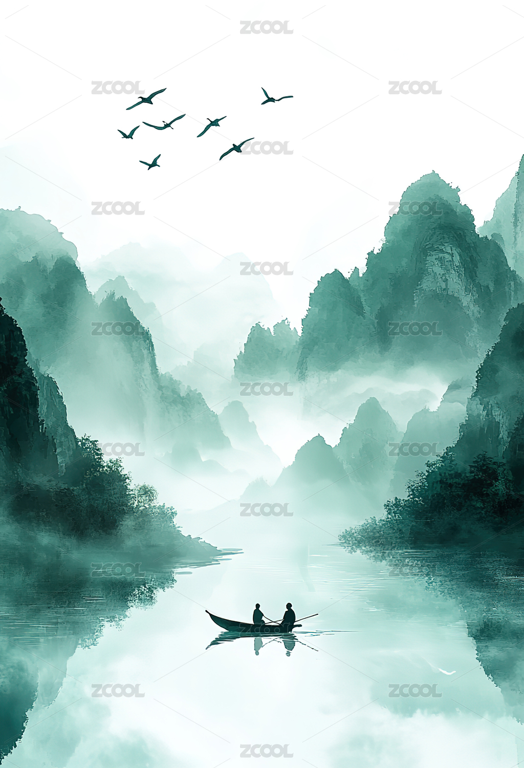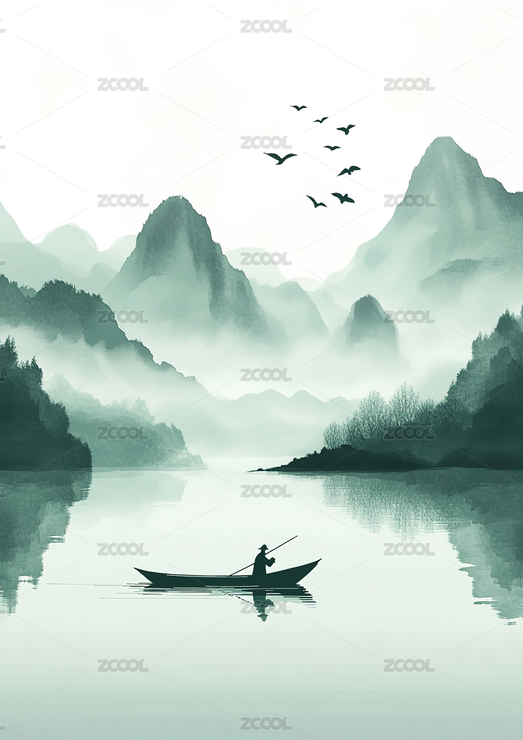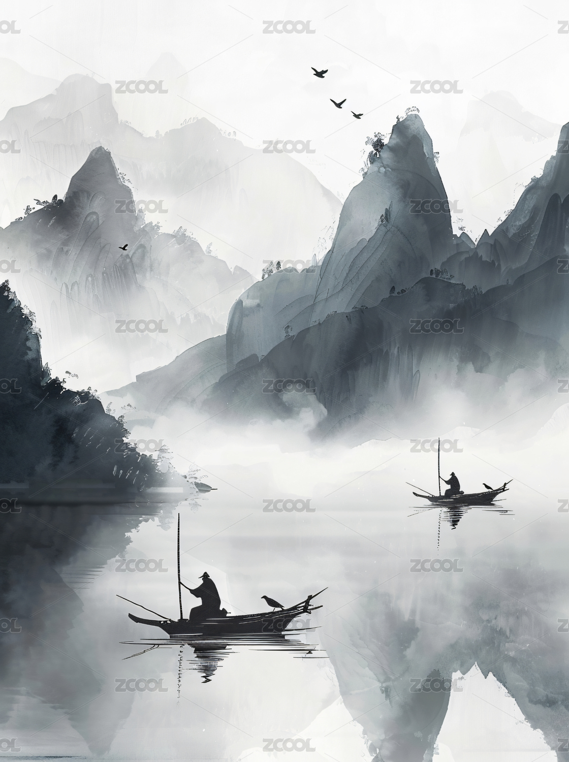 中国风水墨山水画湖面倒影云雾仙境