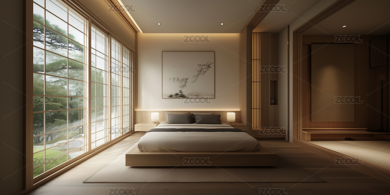 卧室,中式,风格,双人床,木纹,纹理,墙面板,白色,床头灯,床头