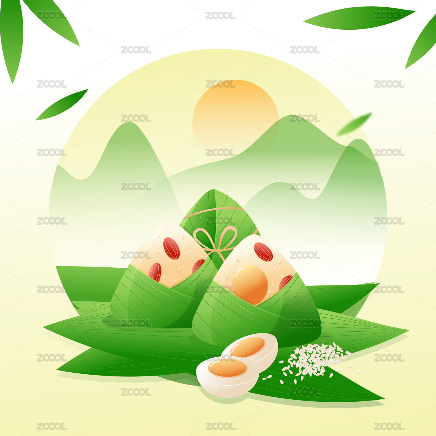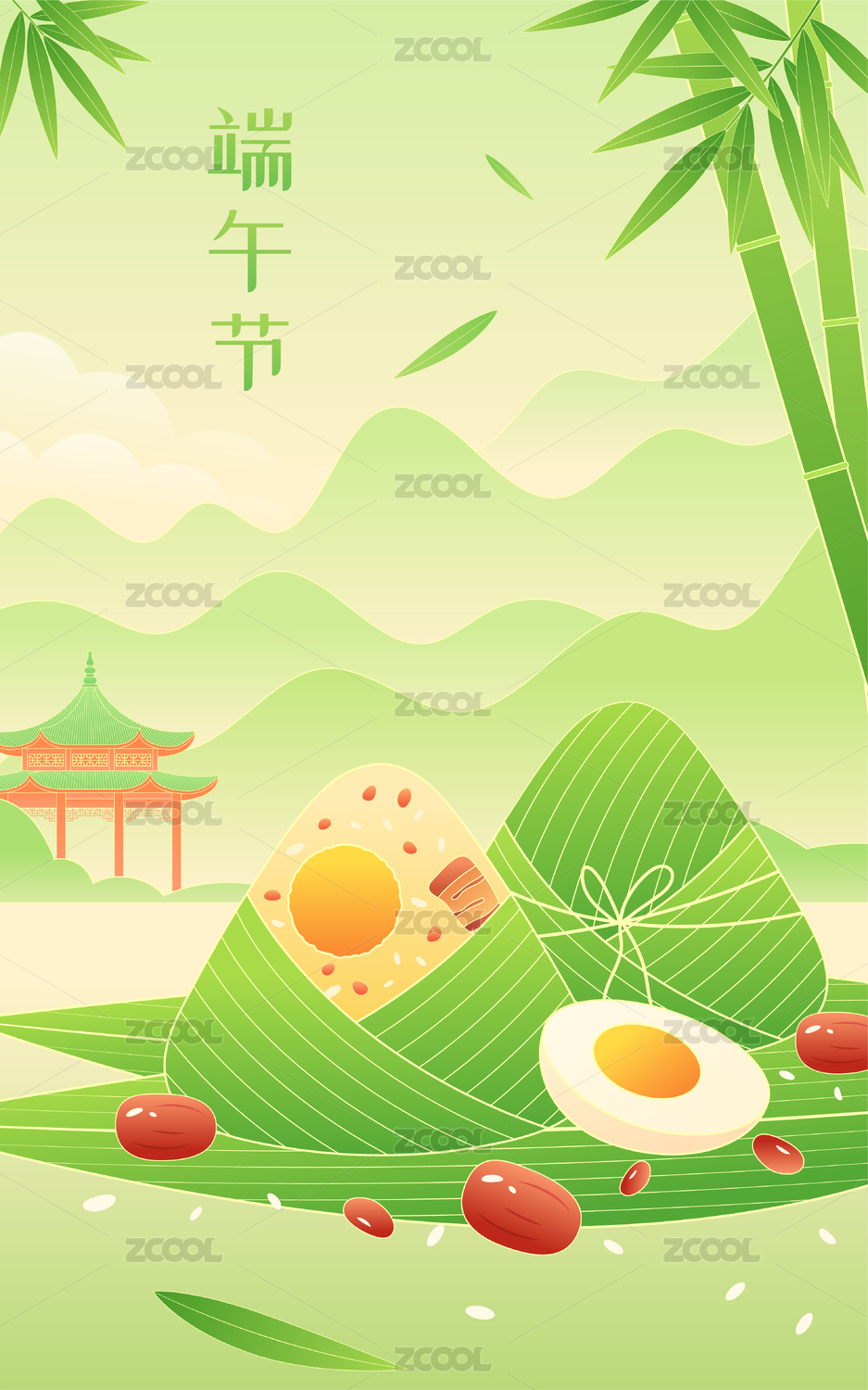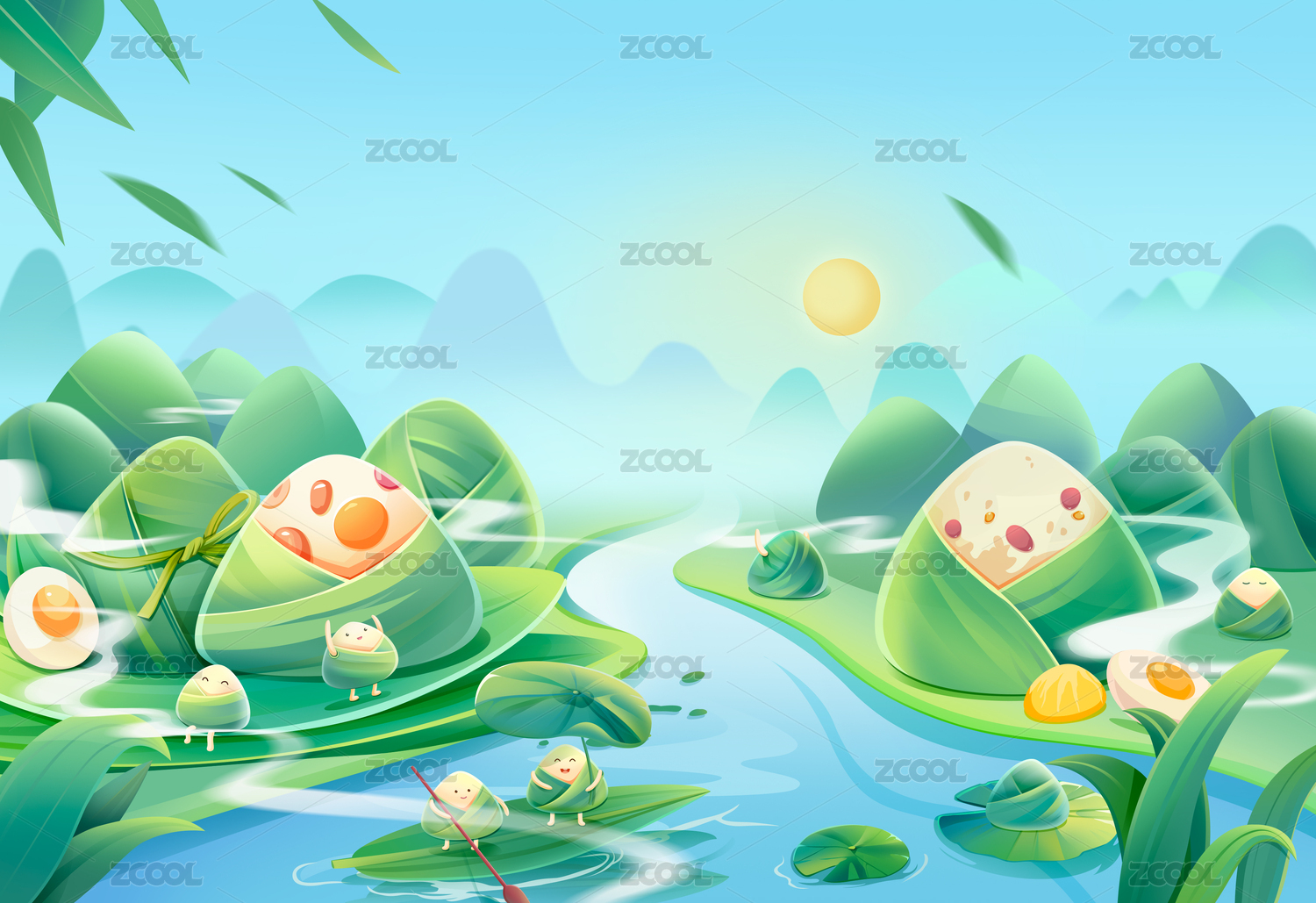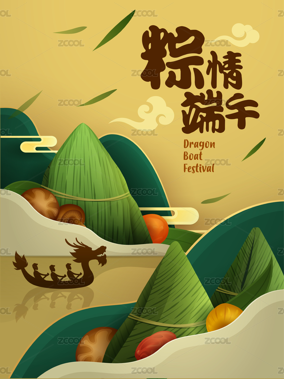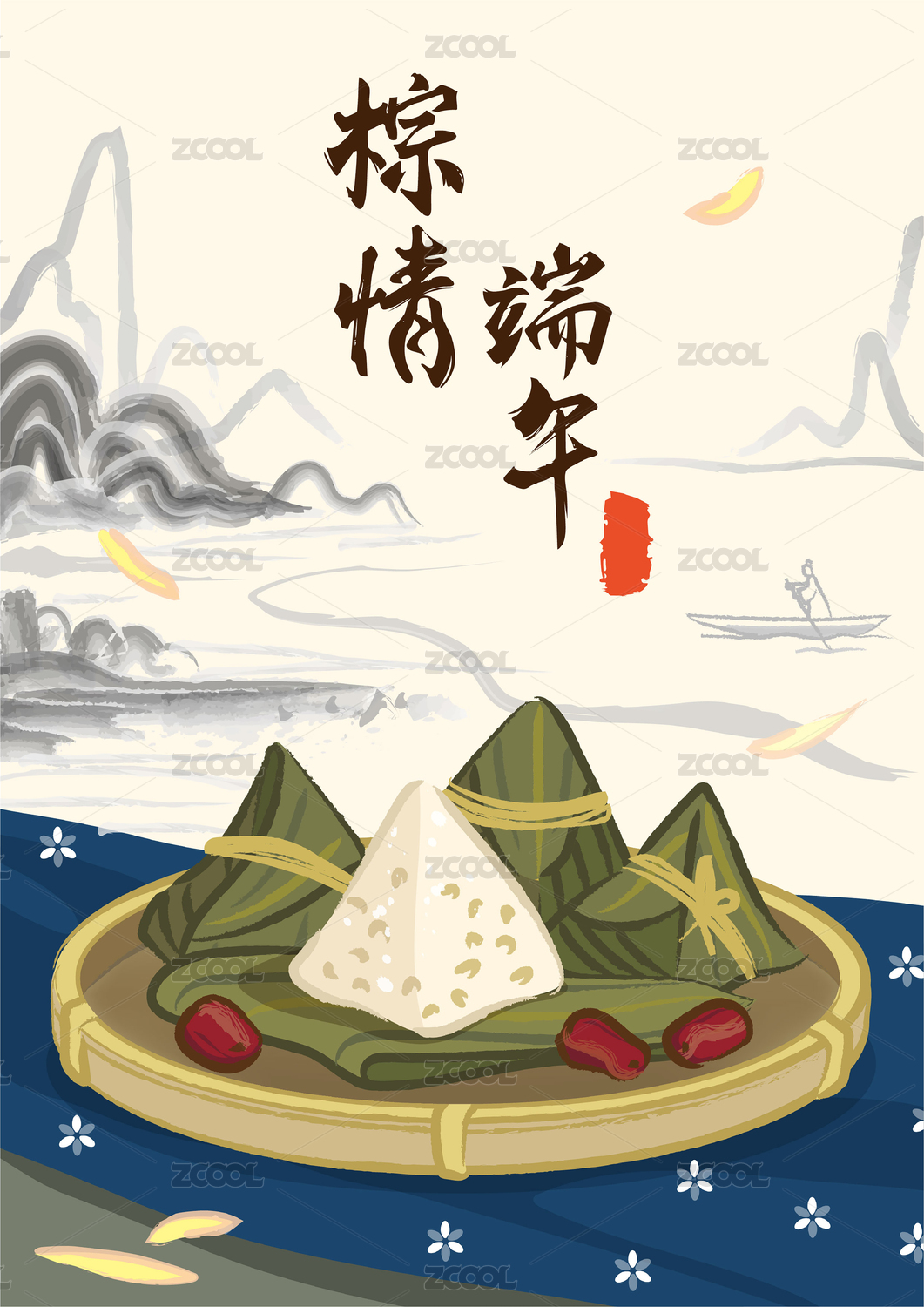 端午节传统节日粽情端午插画竖版:美味的粽子、山水画风景、划船的小人