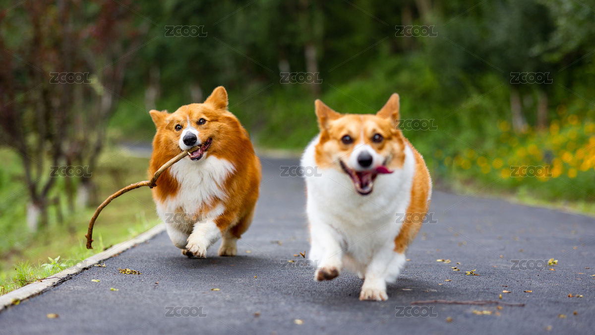 两只柯基狗狗在大自然里奔跑玩耍