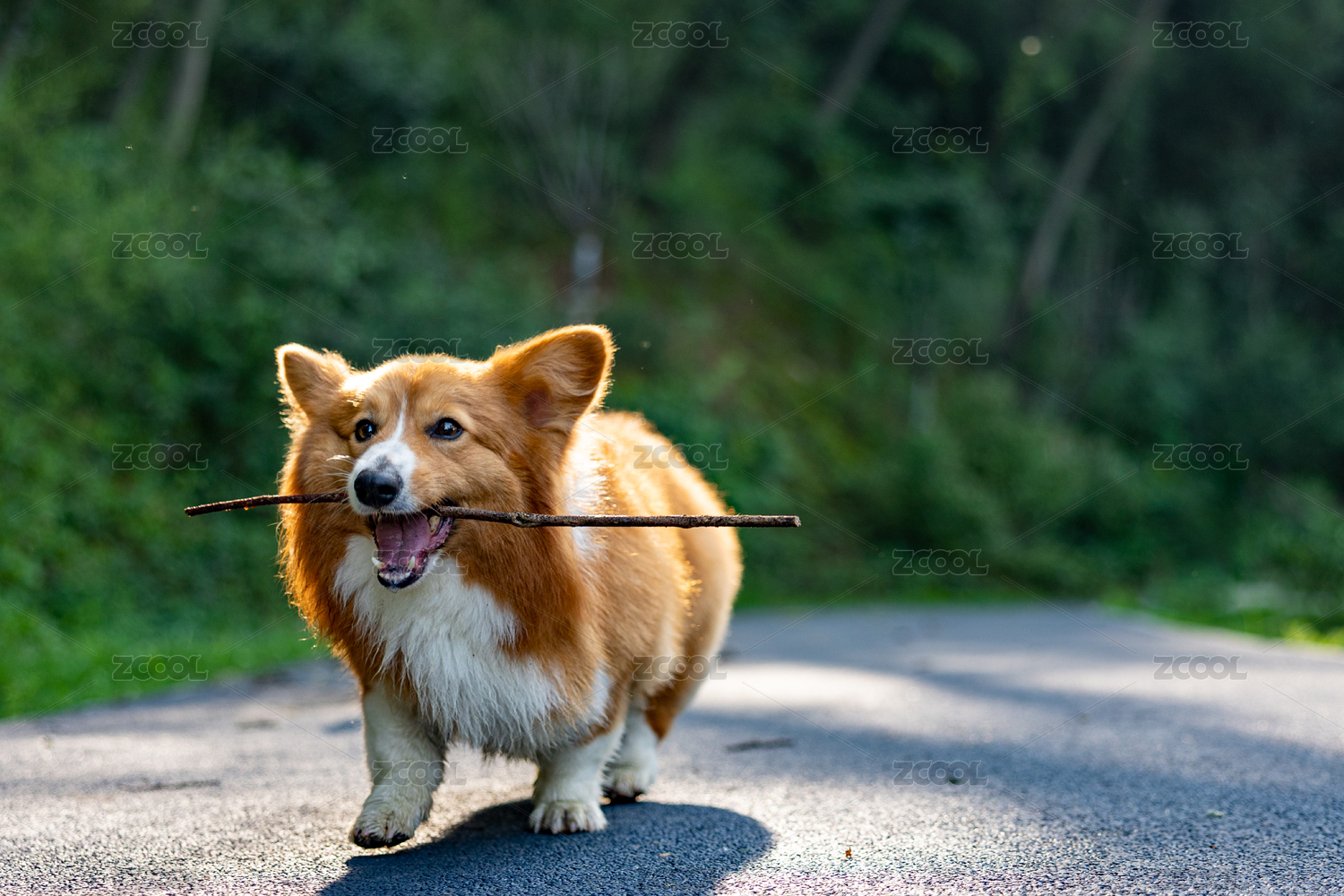 树林里,一只柯基叼着树枝跑