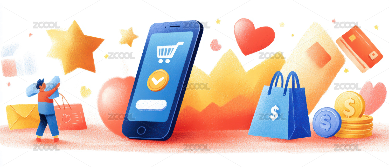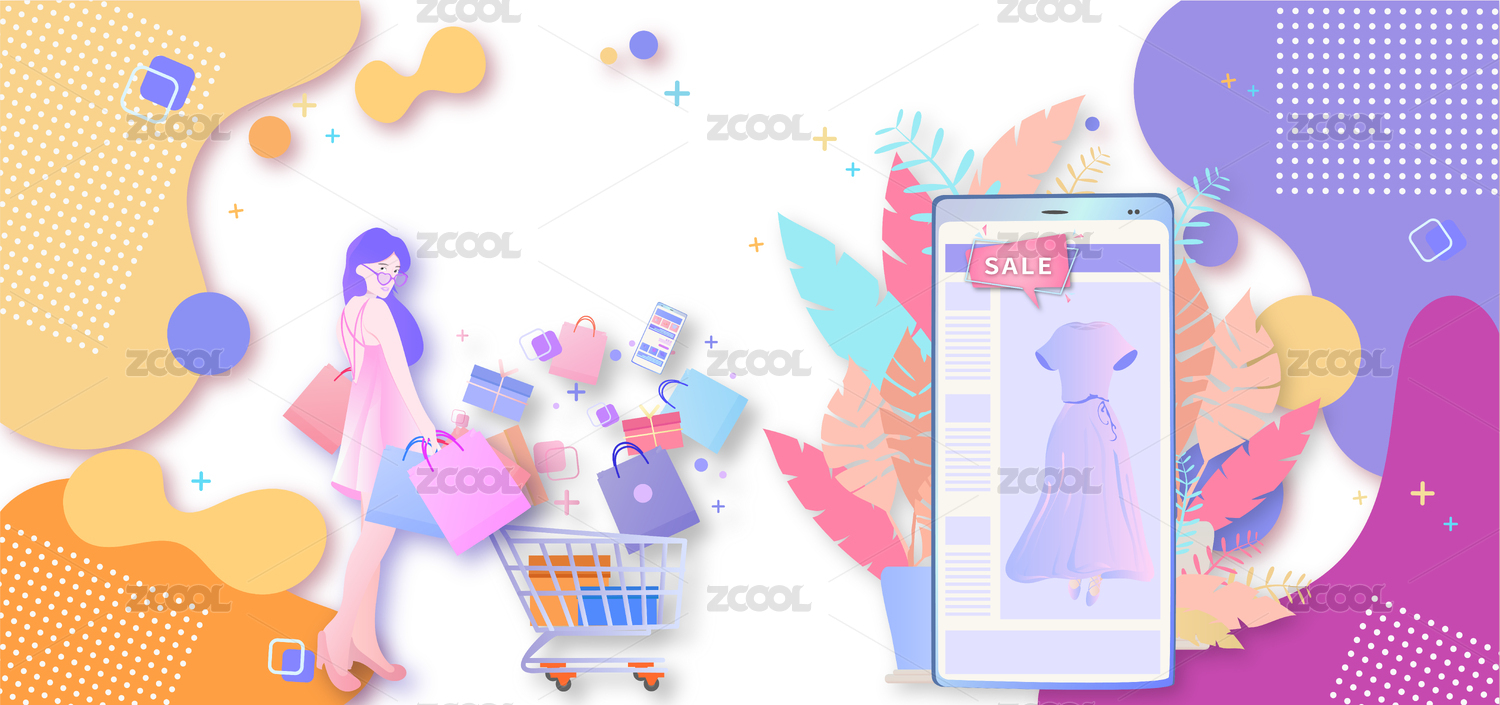电商购物节的节日促销商业活动,时尚女性用手机在网上购物消费的矢量插画背景