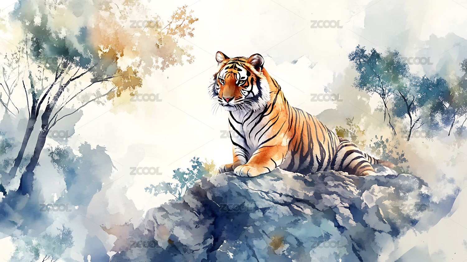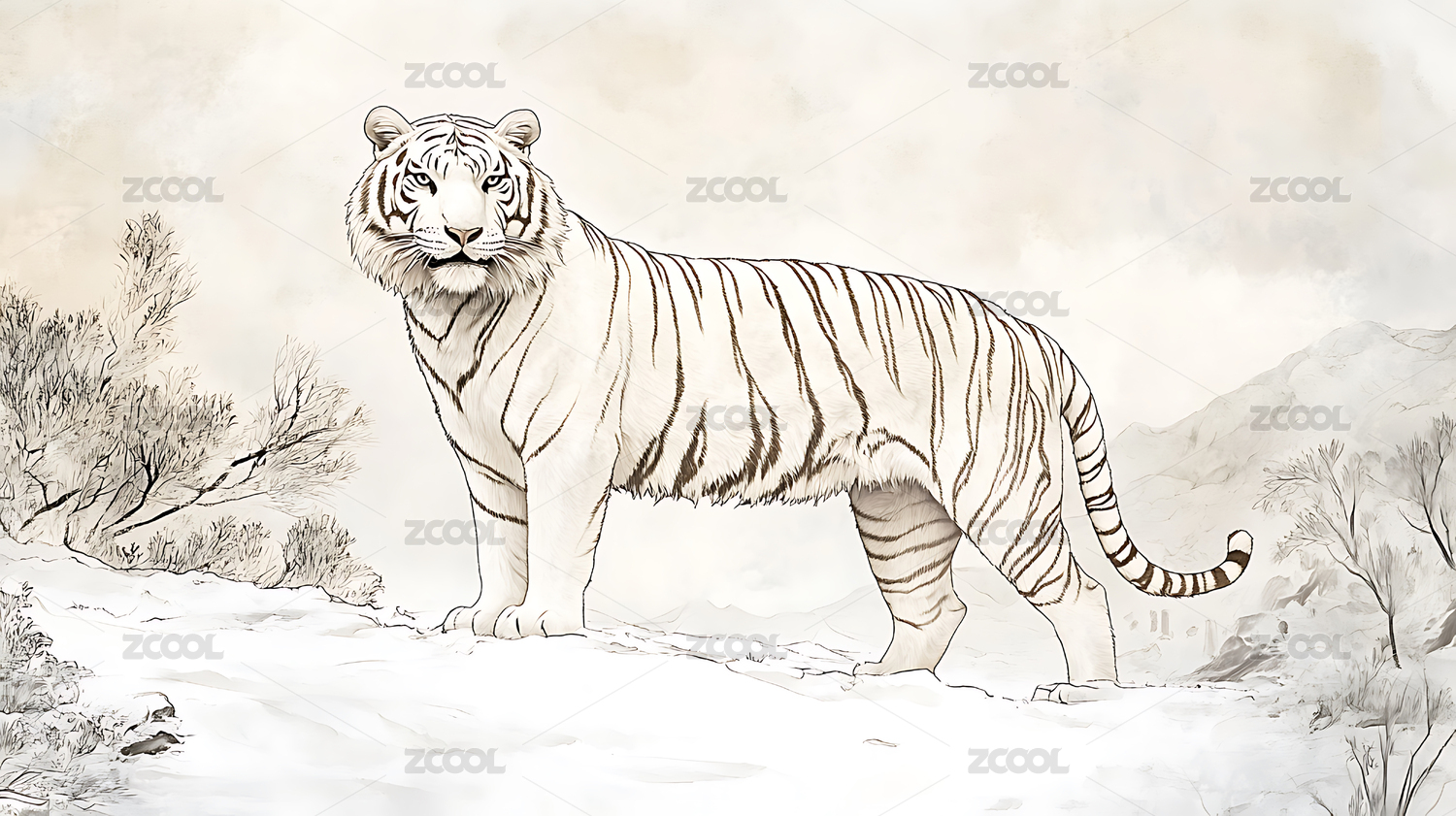 水墨,水墨风,国风,动物,老虎,虎,工笔画,中式,中国风,插画