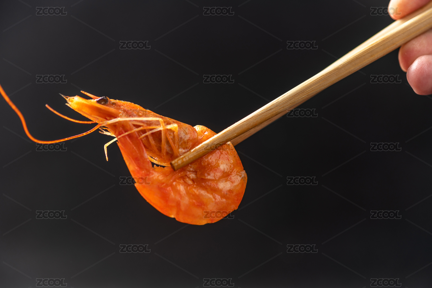 筷子夹大虾特写黑色背景