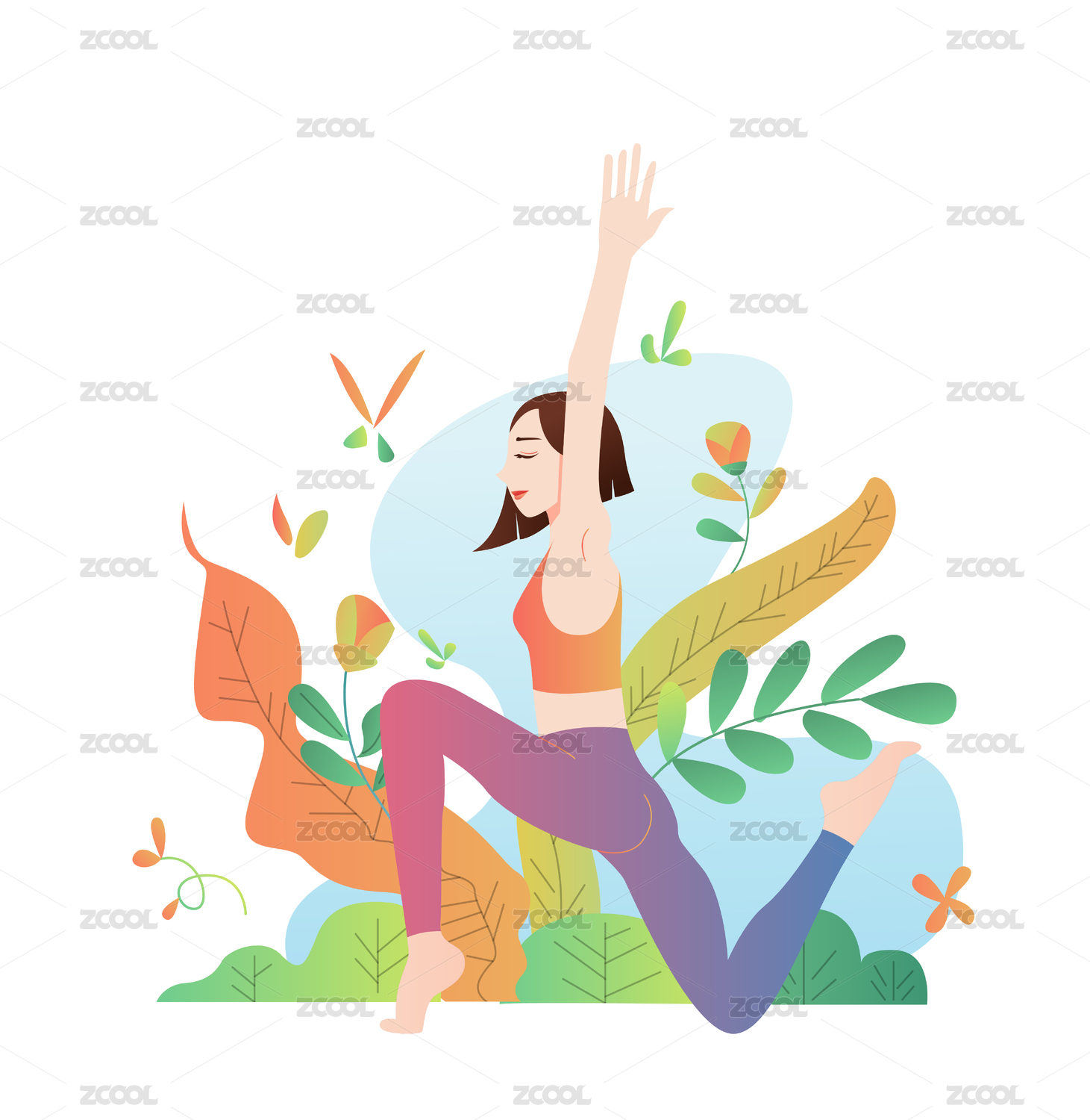 卡通扁平练瑜伽的长发女孩在阳光的照耀下