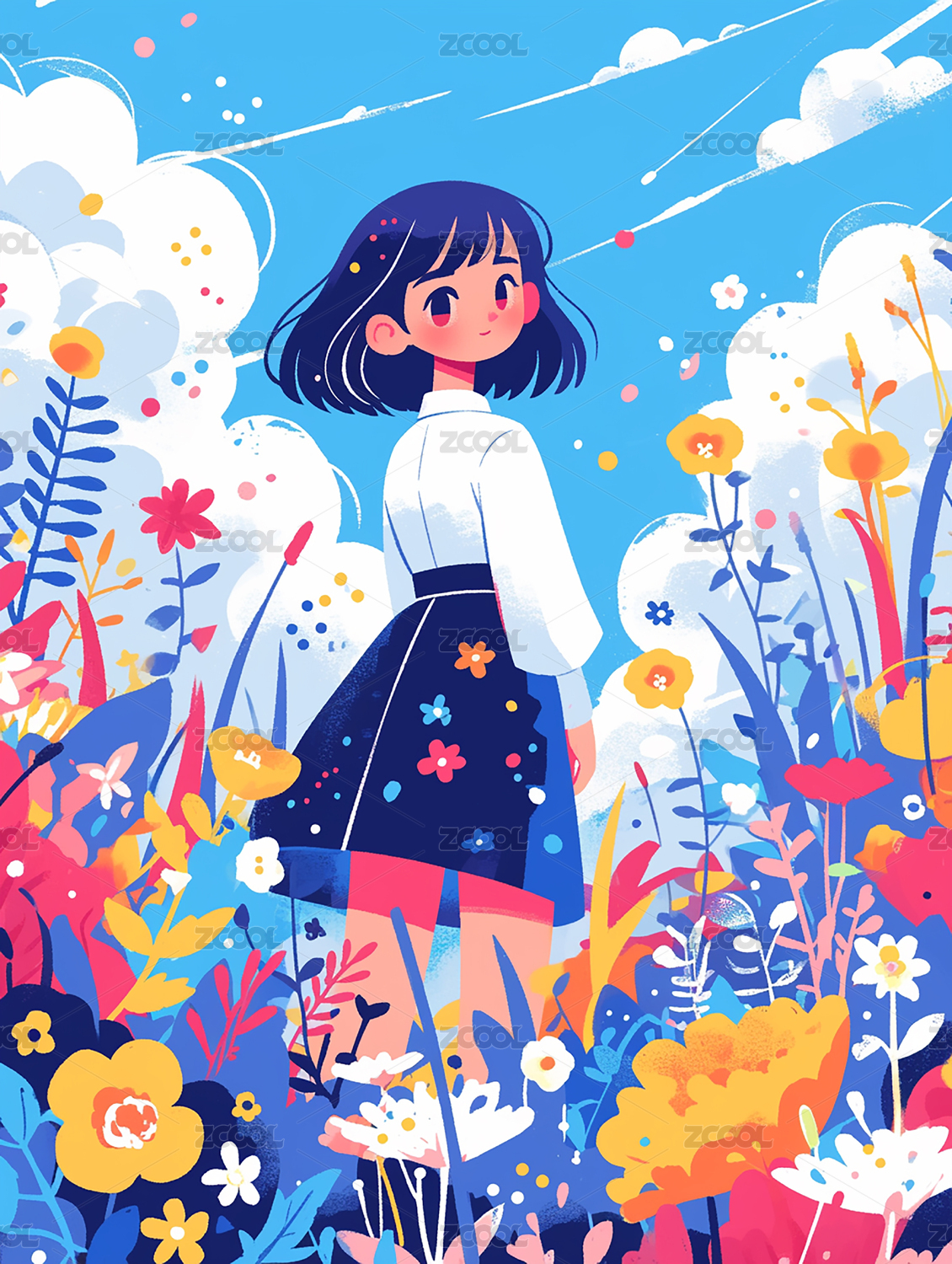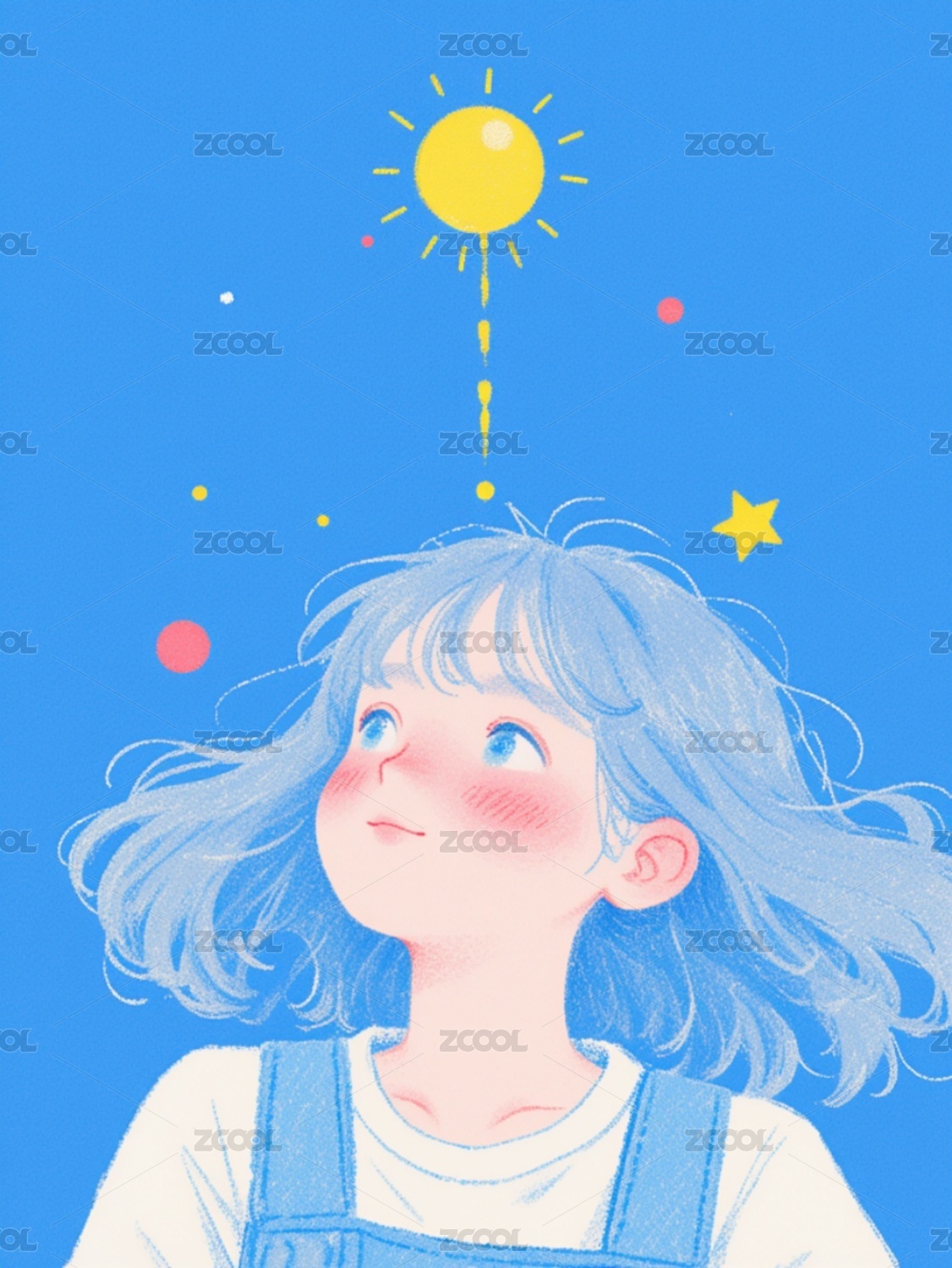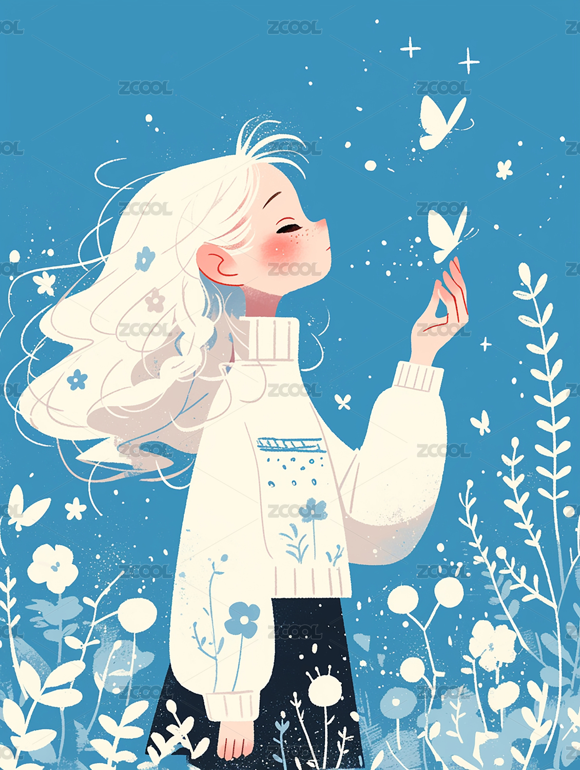 蓝色背景上一个吹着蒲公英的小女孩艺术插画