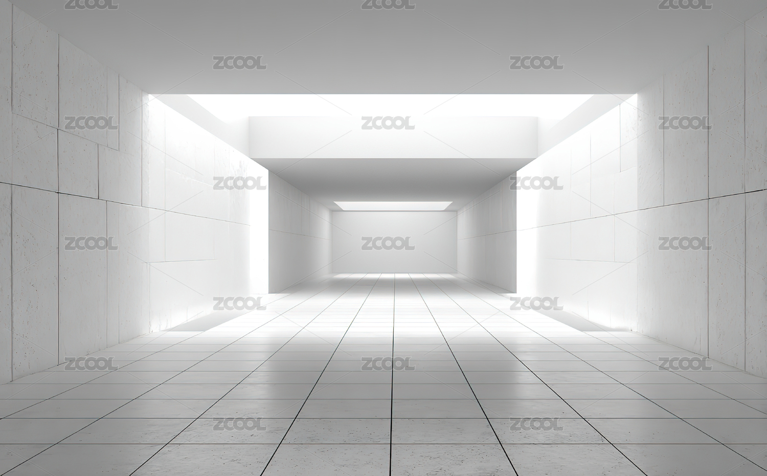 干净明亮的白色向前延伸未来室内走廊建筑。