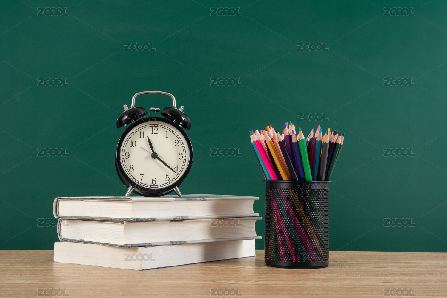 黑板前一摞书和书上一个装满彩铅笔的笔筒