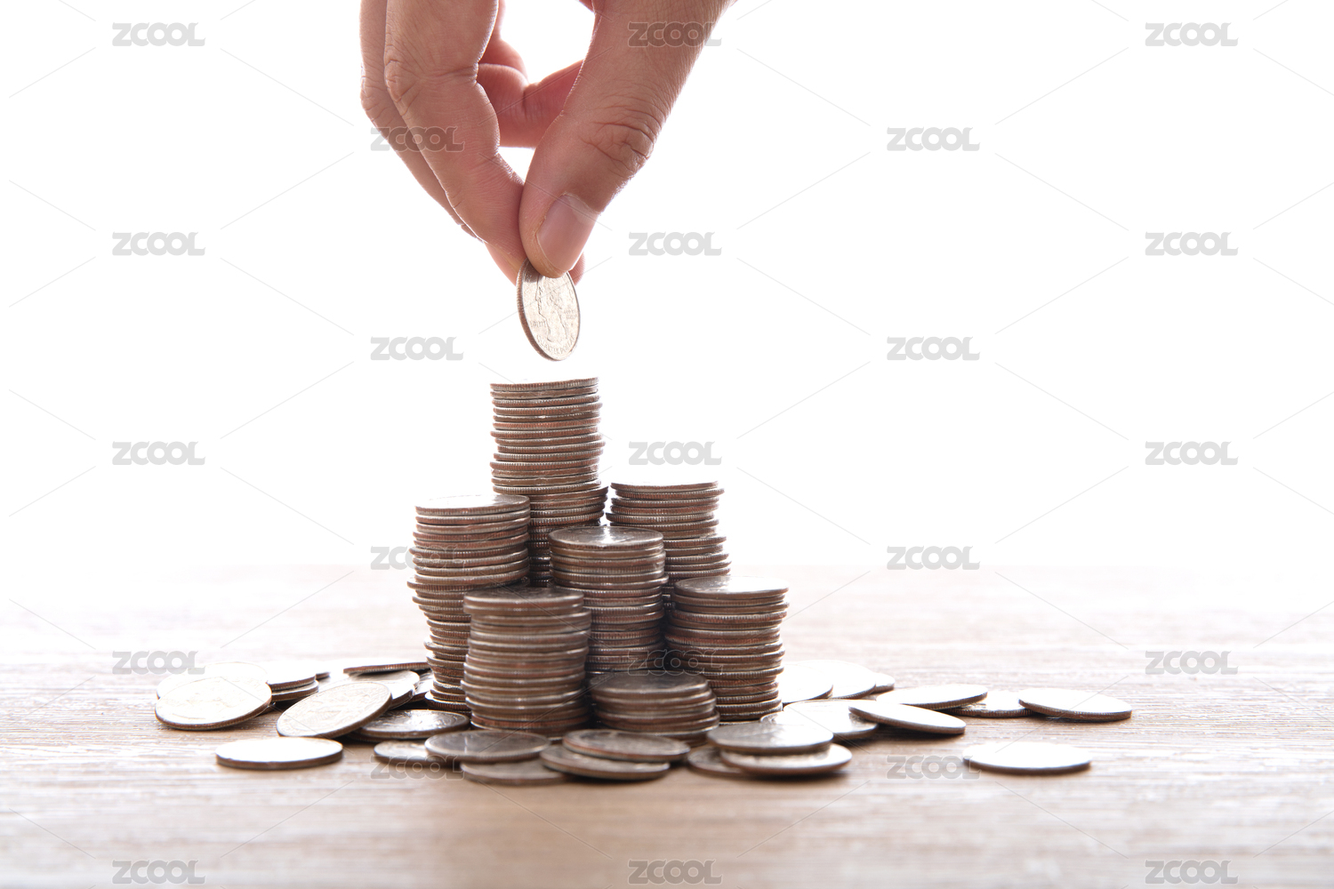 白背景前的桌子上一堆美元硬币及一只手拿着硬币继续加码