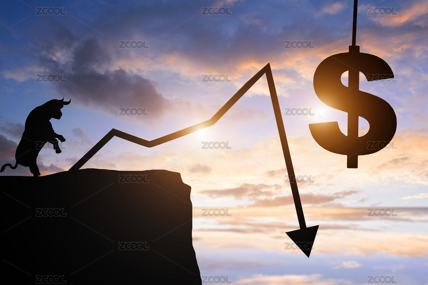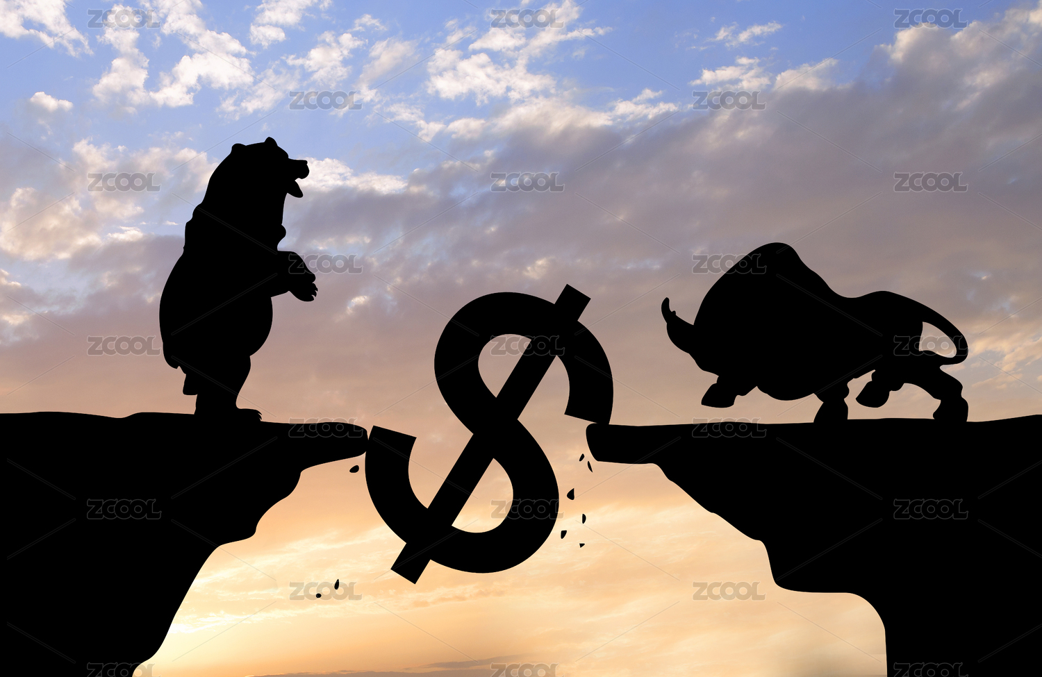 悬挂在悬崖上剪影效果的美元符号及黑熊与斗牛的对抗