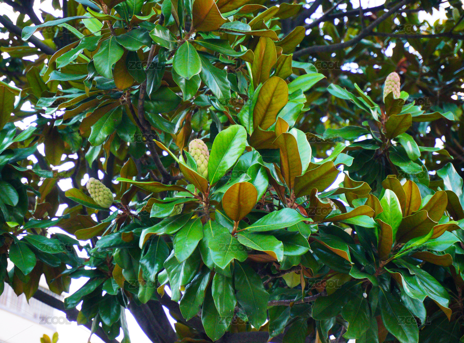 广玉兰枝叶与未绽的果实