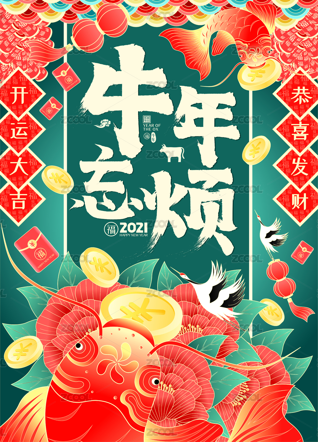 牛年大吉锦鲤牡丹仙鹤送福开运春节海报