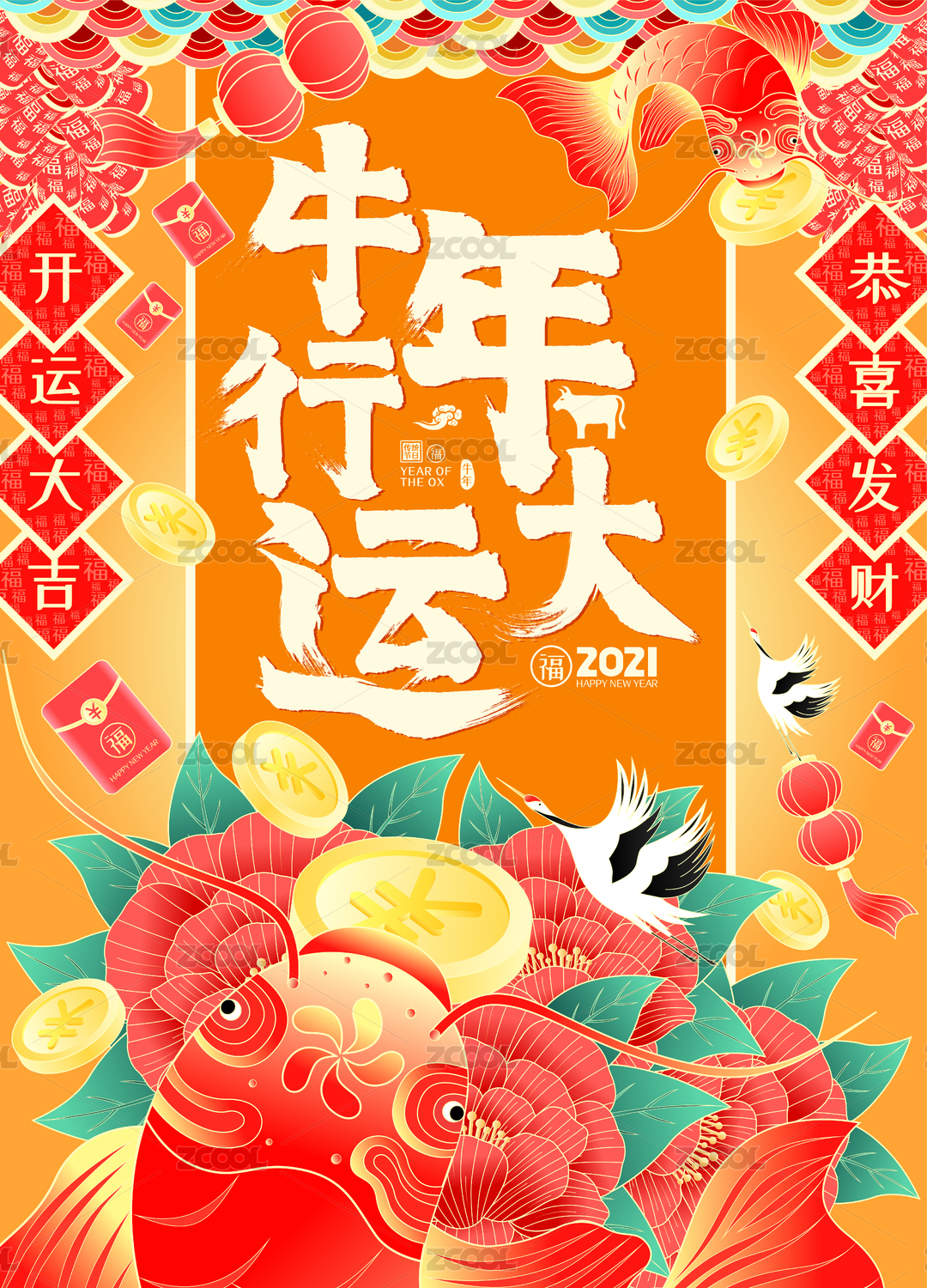 春节牛年行大运牡丹花开锦鲤开运矢量海报