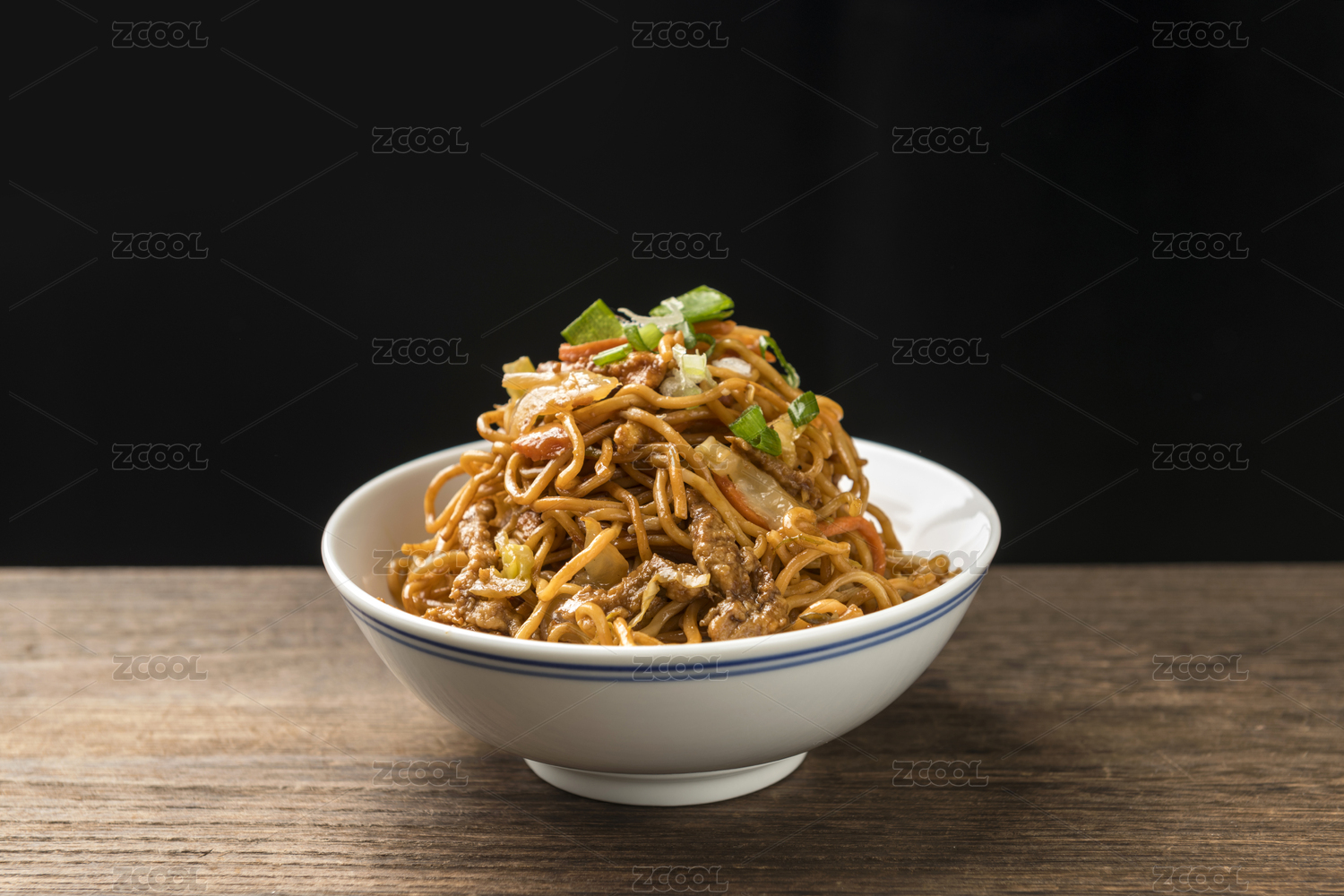 一碗炒面摆放在木桌面上特写