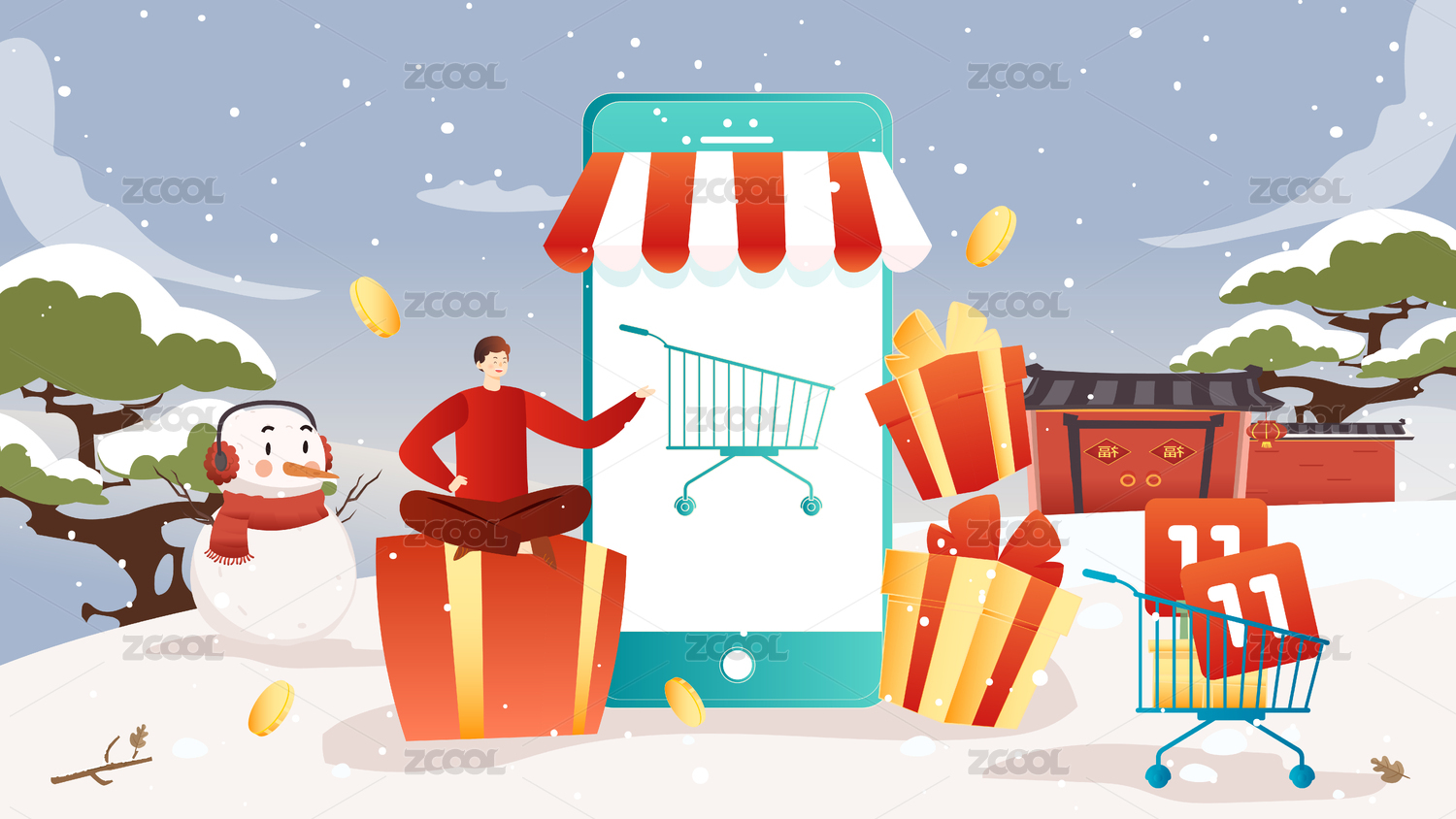 冬季新年购物矢量图