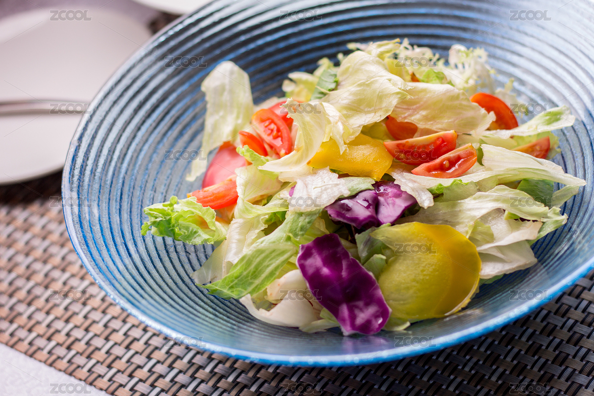 健康美味的蔬菜沙拉盛放在蓝色玻璃沙拉碗中