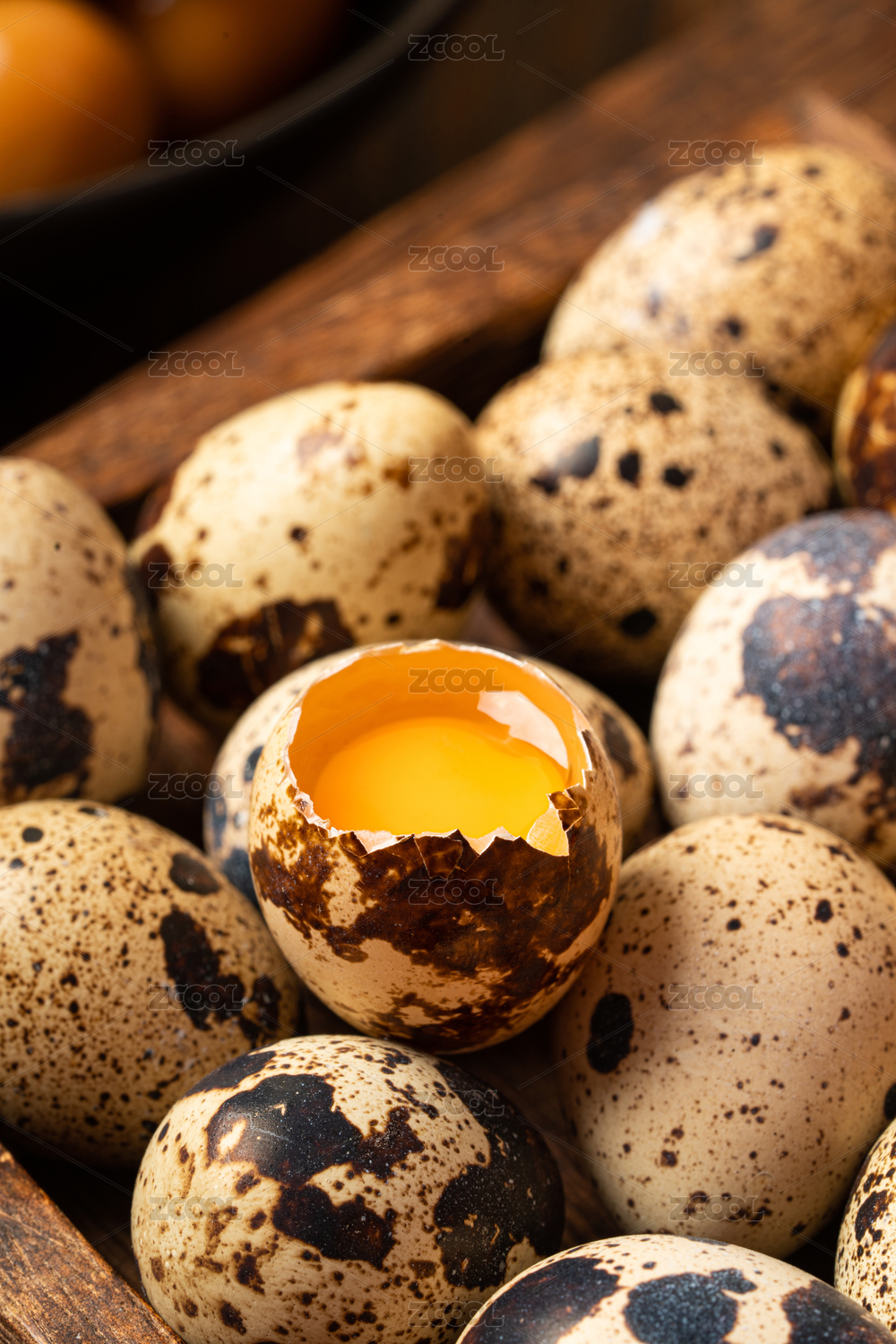 装木盘里的鹌鹑蛋,有一个敲破去壳露蛋黄
