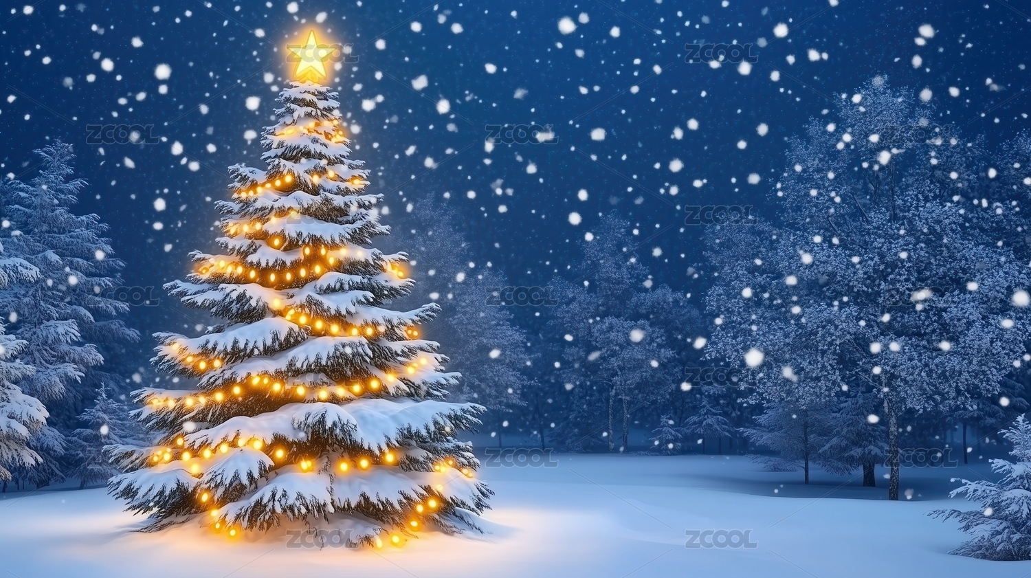 雪夜圣诞树与彩灯