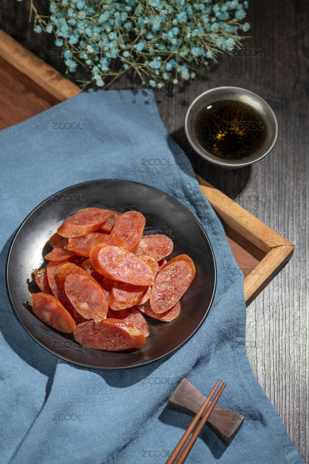 腊肠,广式腊肠,腊肠片,一盘,一盘腊肠,腊肠切片,肉制品,干肠制品,切片,筷子