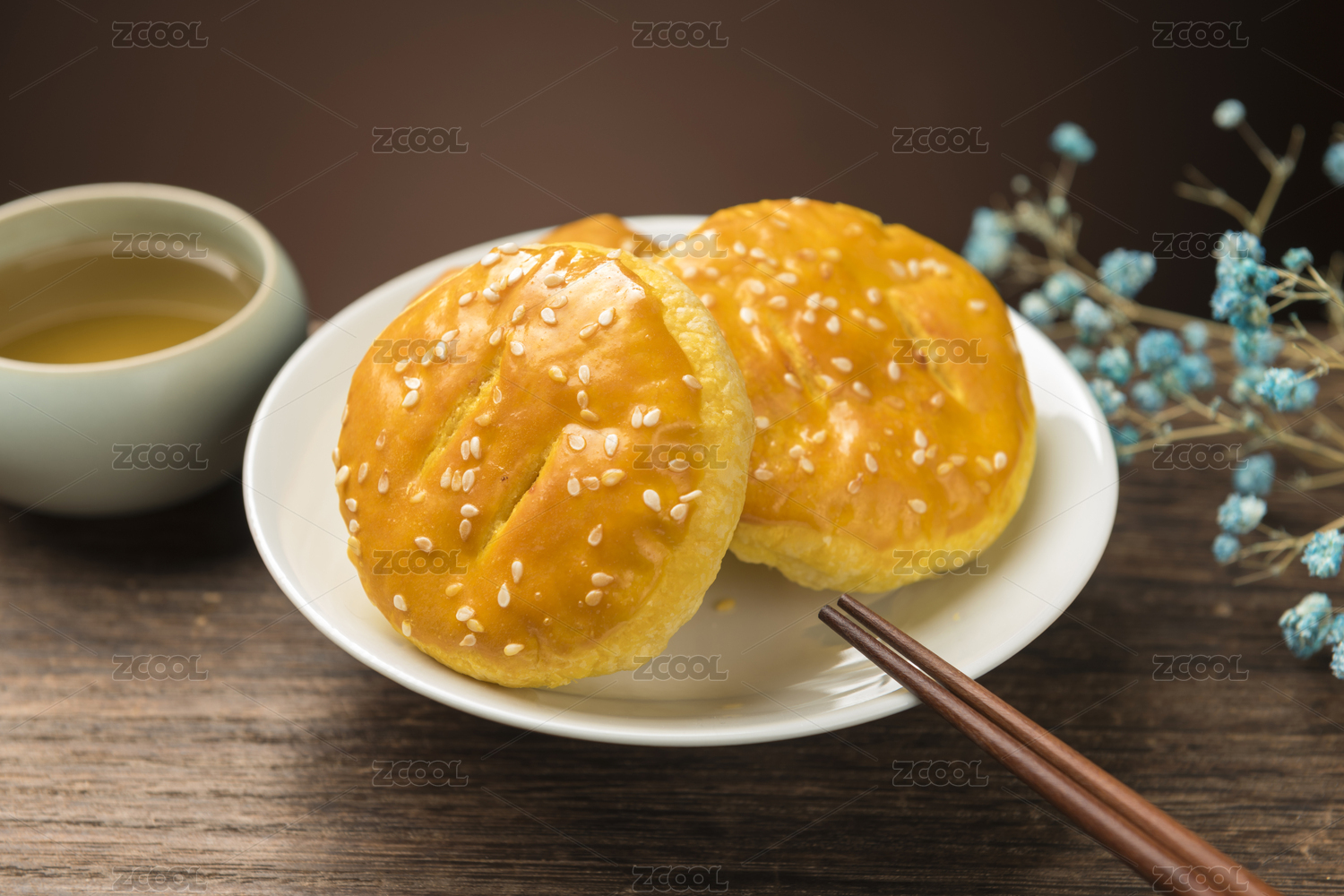 传统面食芝麻烧饼特写木桌面古窗棂背景
