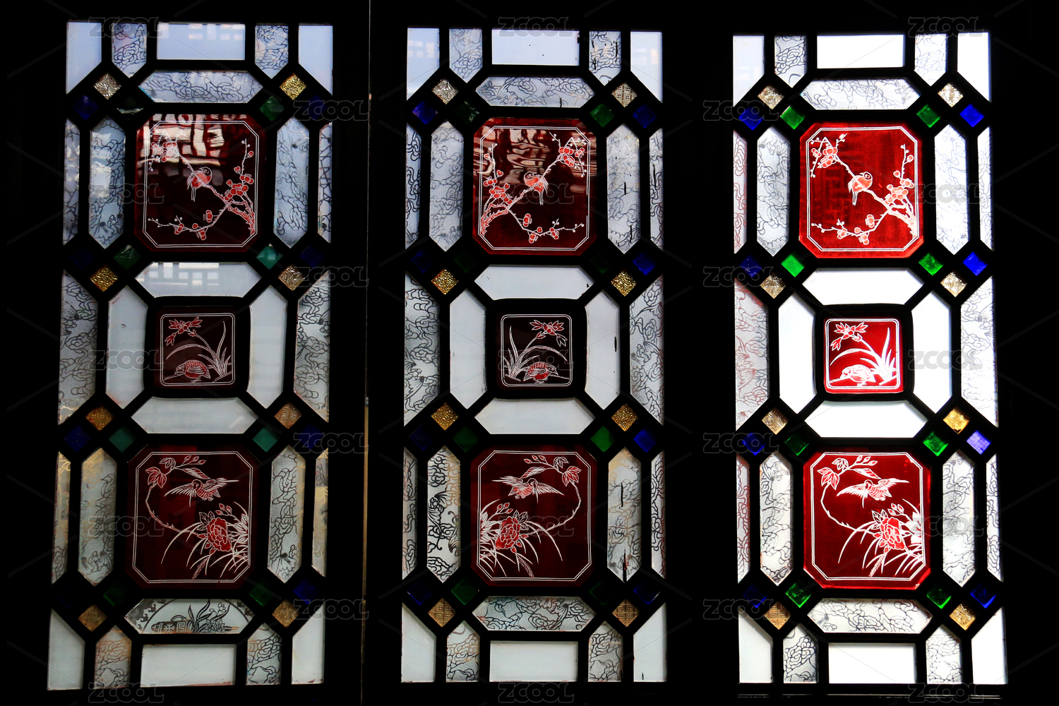 中国岭南古建筑的彩色玻璃窗满洲窗特写