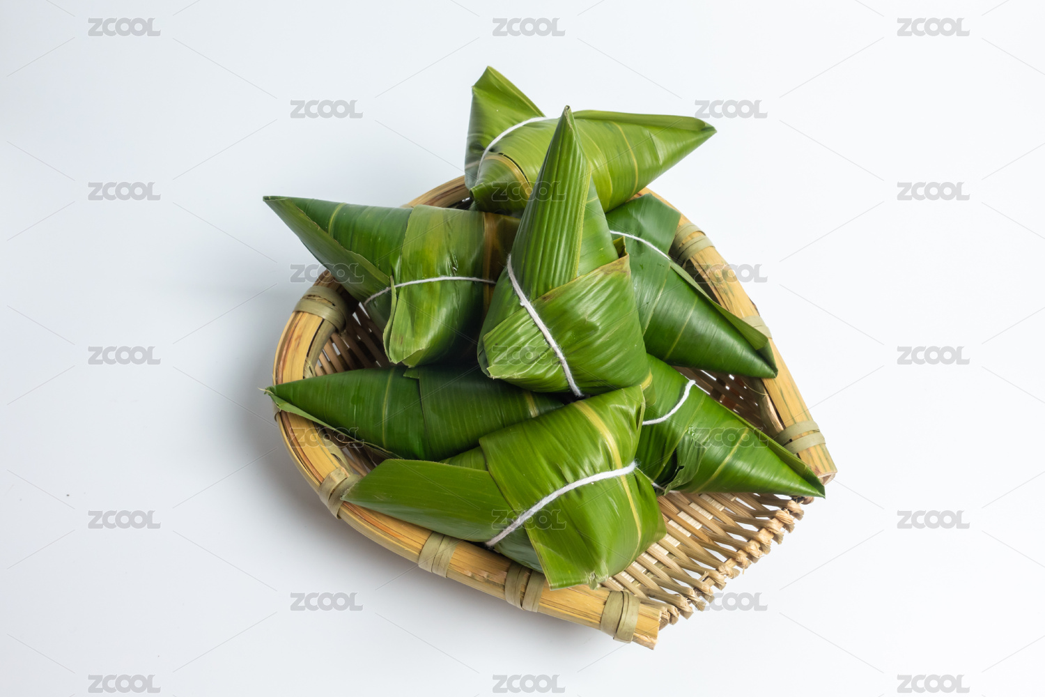 摆放在白色背景下被包裹的粽子