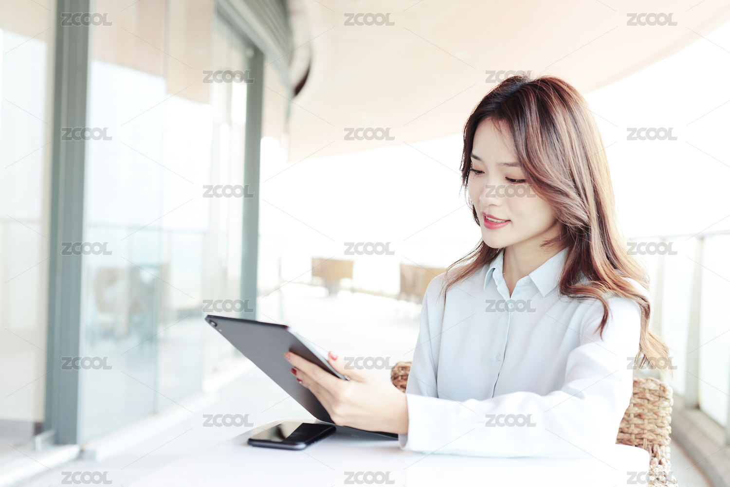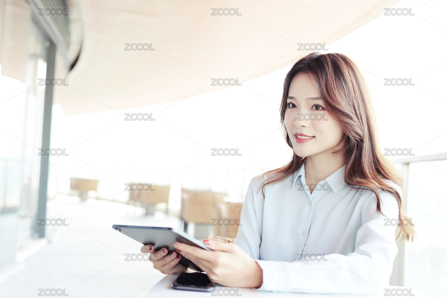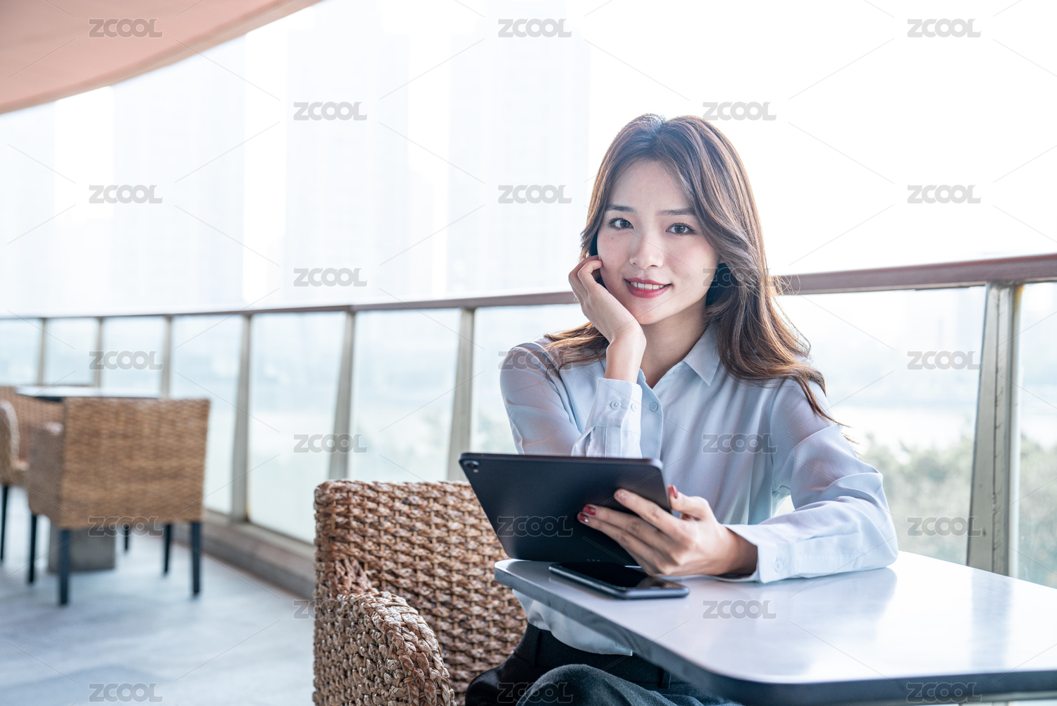 一个中国年轻女白领坐在室外咖啡厅用平板电脑