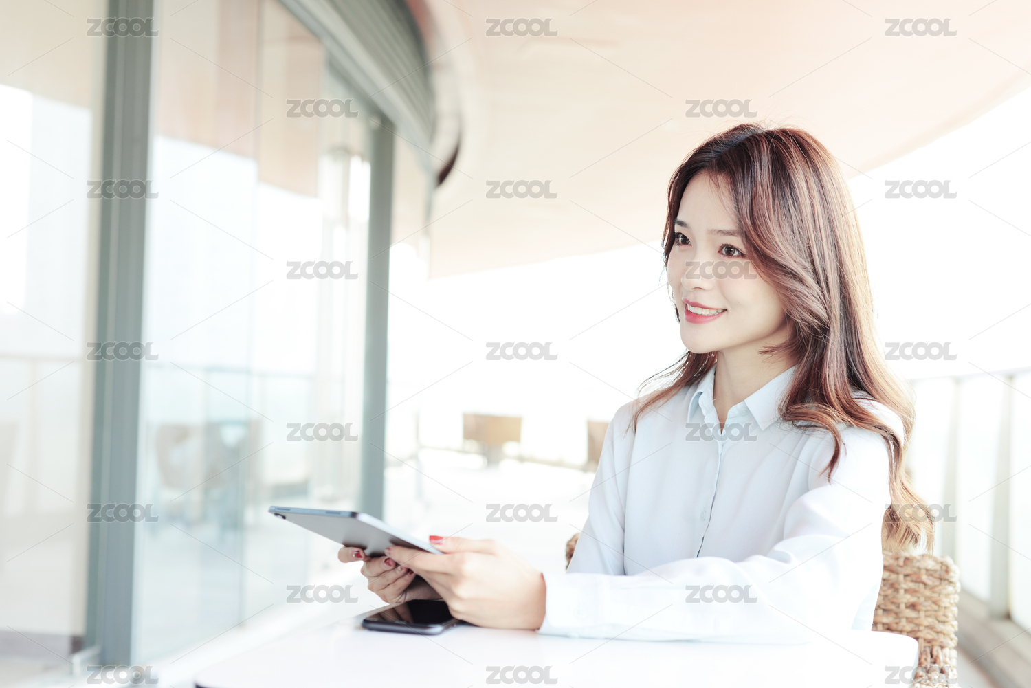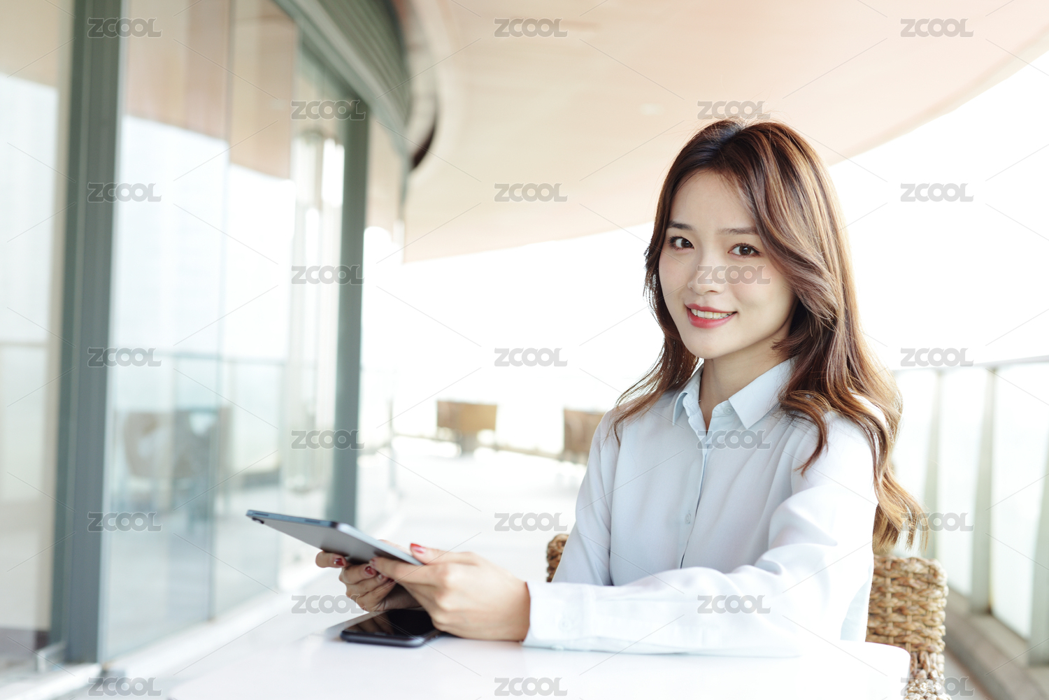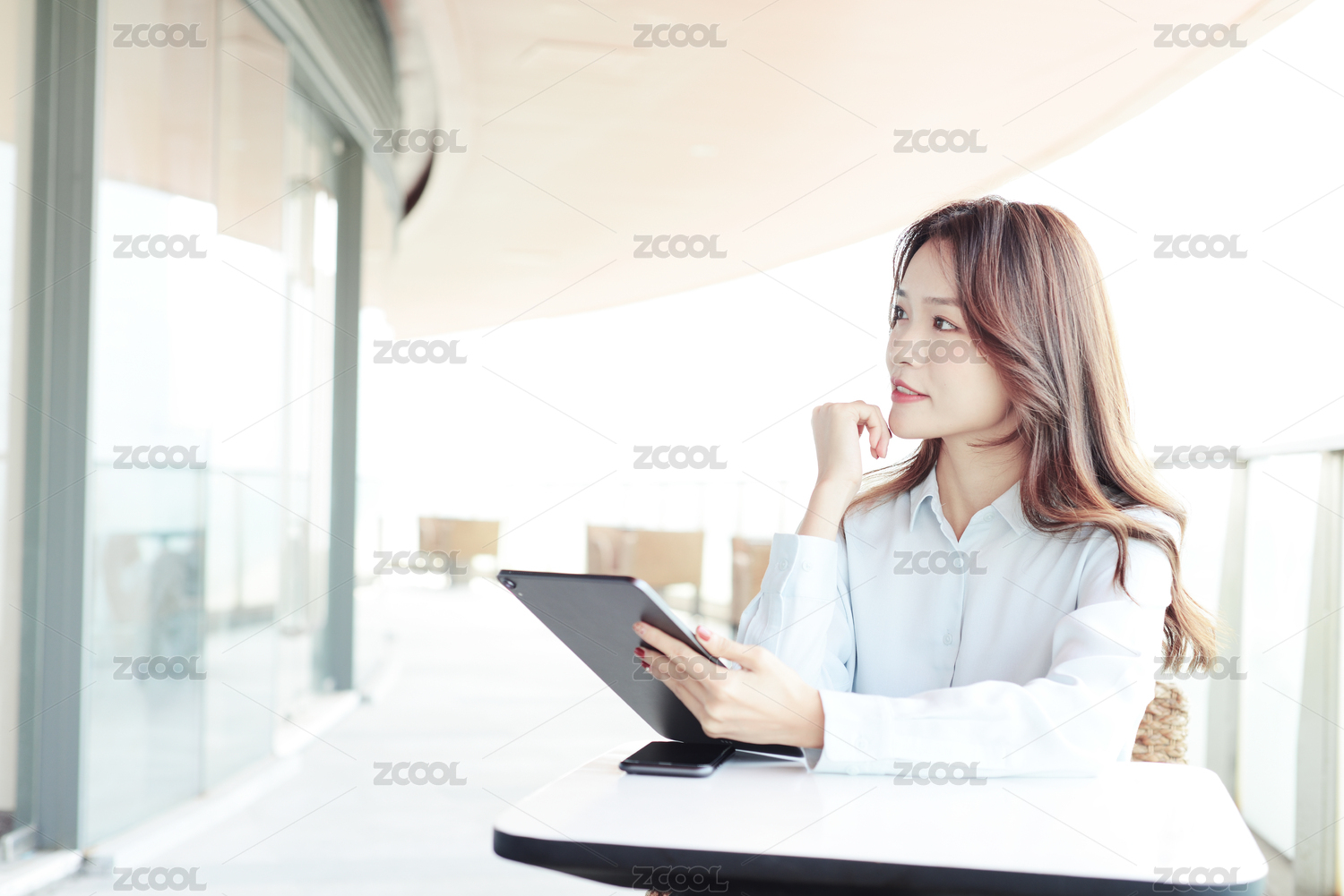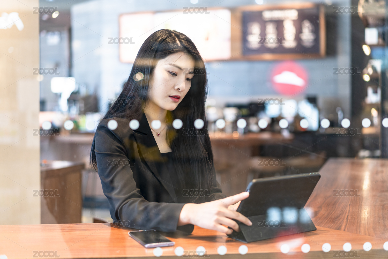 一个中国年轻女白领坐在室外咖啡厅用平板电脑