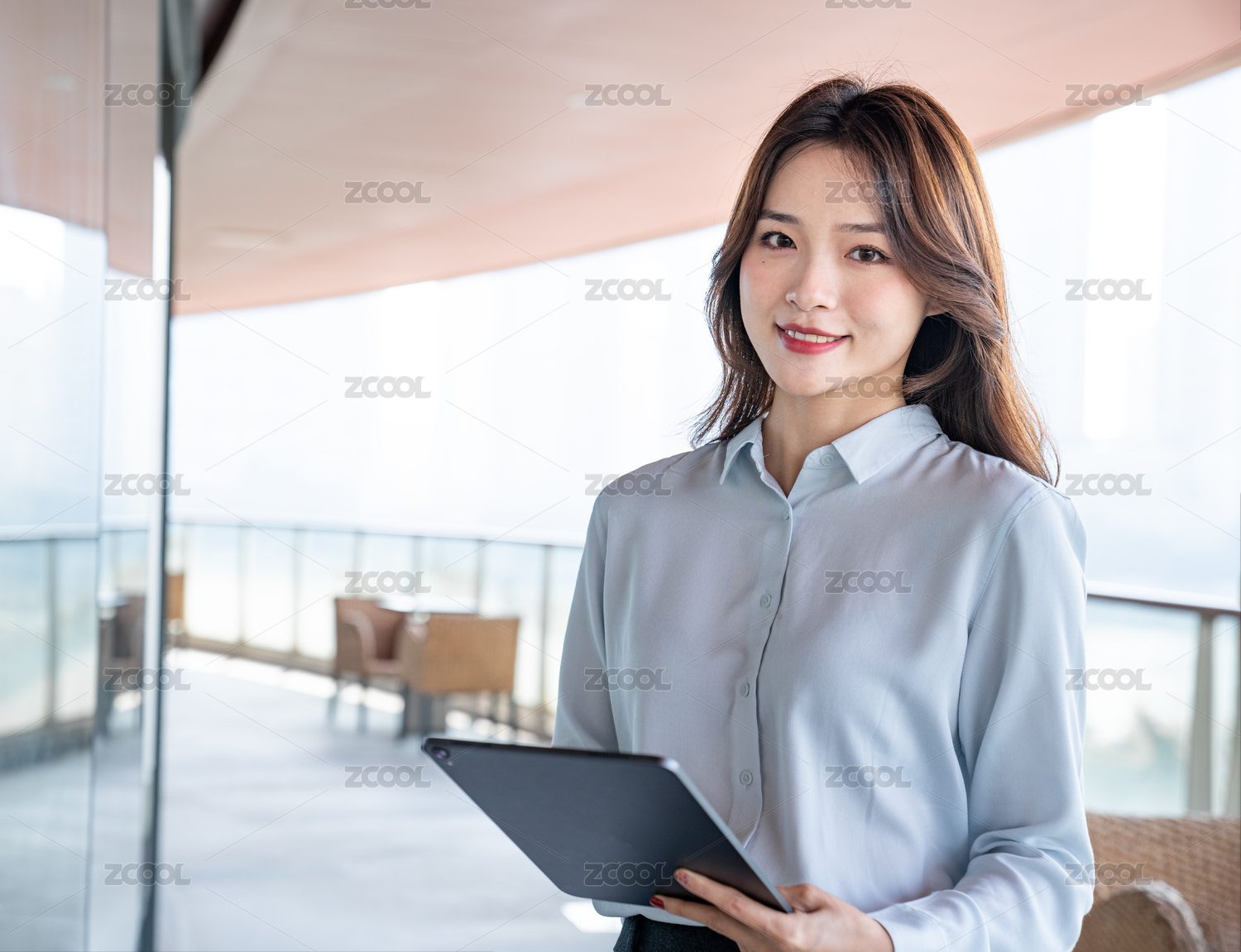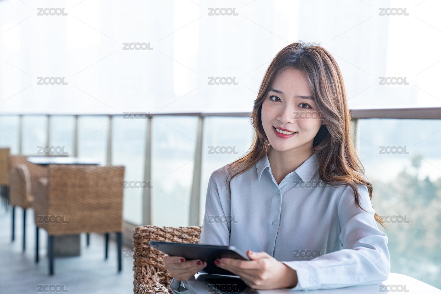 一个中国年轻时尚的职业女性脸带微笑看着平板电脑
