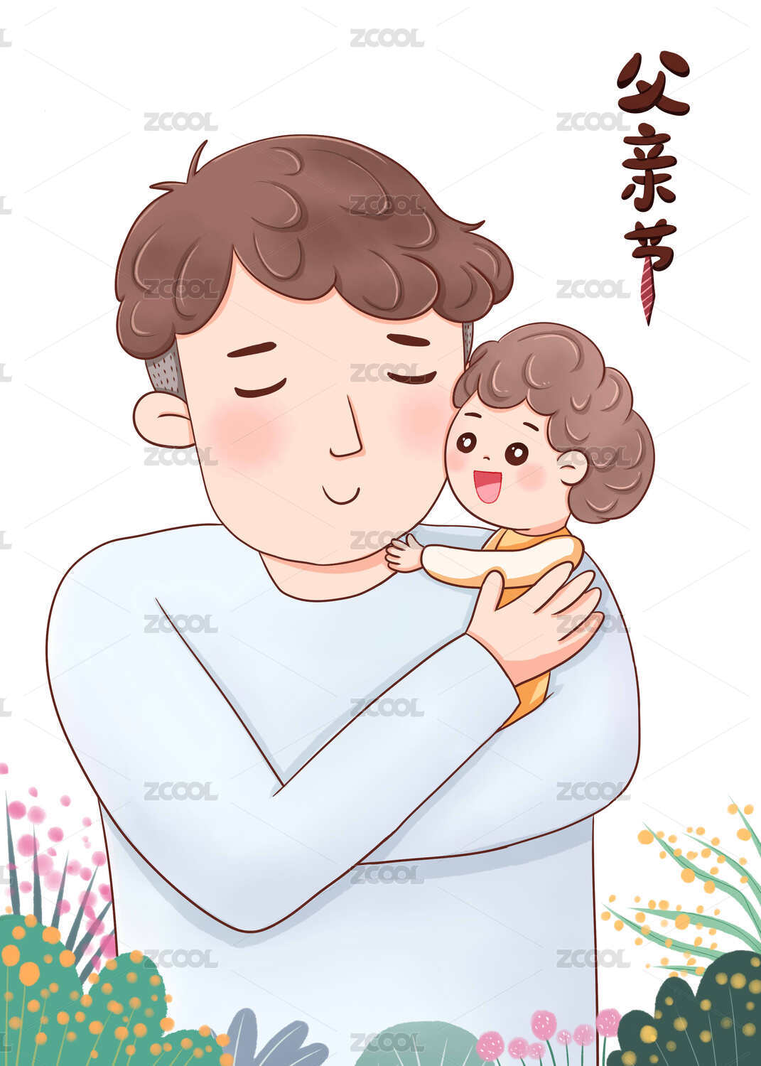 爸爸抱着熟睡婴儿的父亲节插画带文字竖版