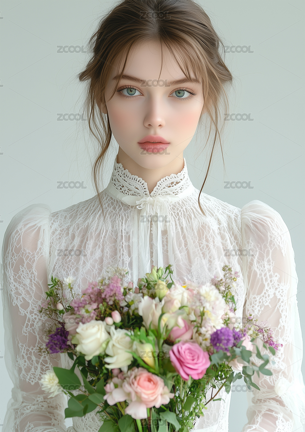 欧美蕾丝白衫少女与玫瑰花束