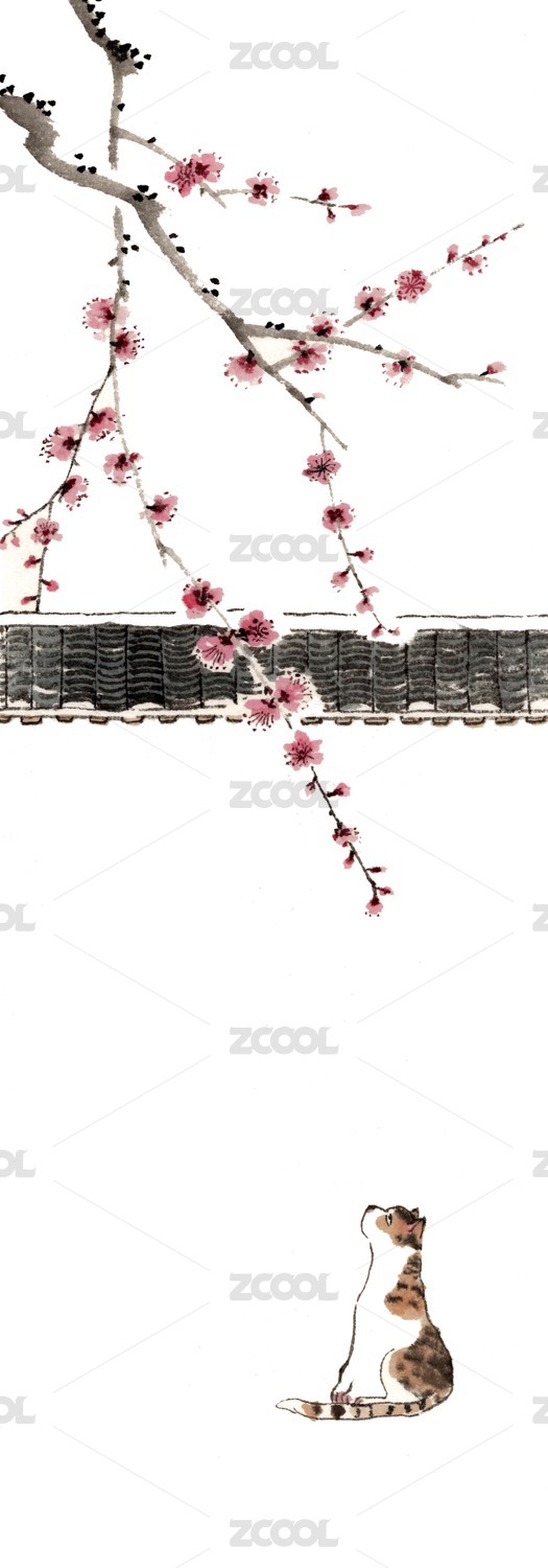 水墨传统文化插画春天里大自然小花猫麻雀杏