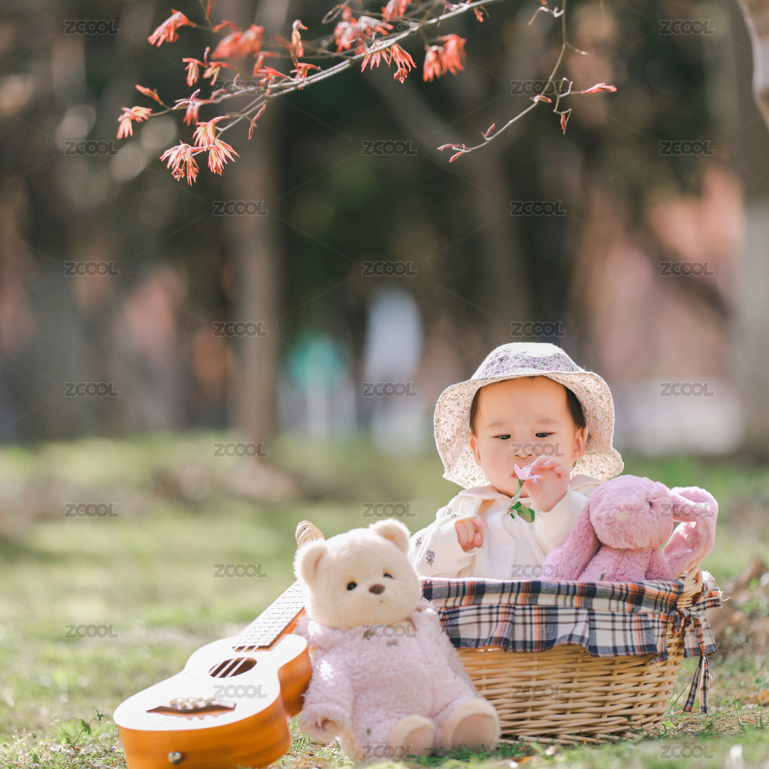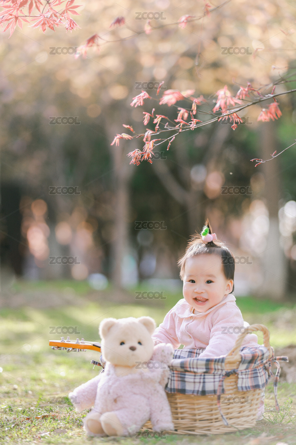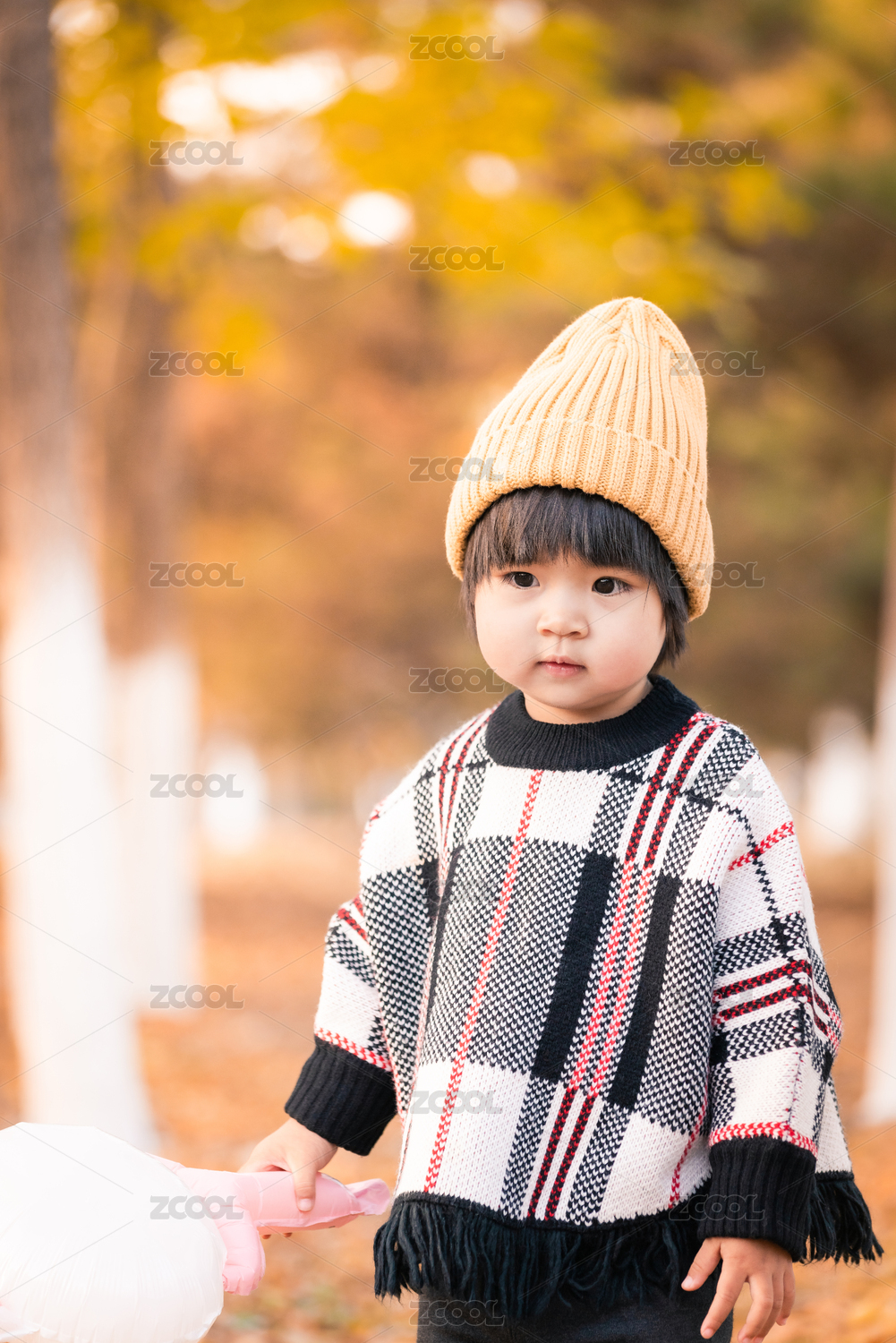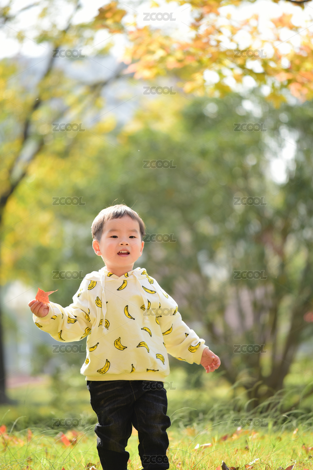 秋天蹲在满是树叶的草地上玩耍的小朋友