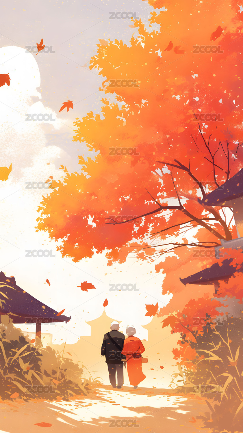 AIGC202402,扁平,水彩,秋天,写意,枫叶,漫步,散步
