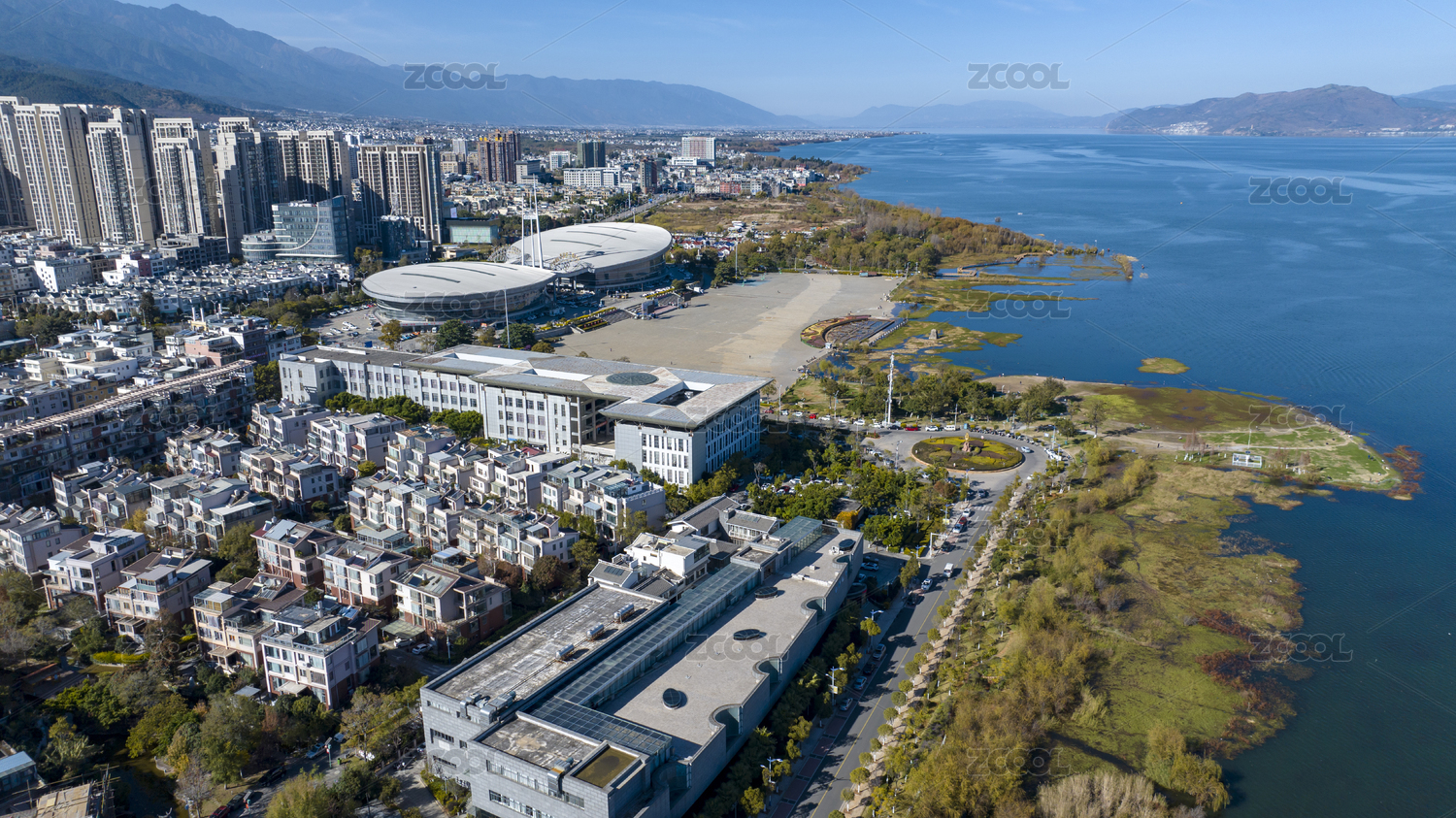 中国云南省大理市俯瞰洱海外滩城区高楼建筑