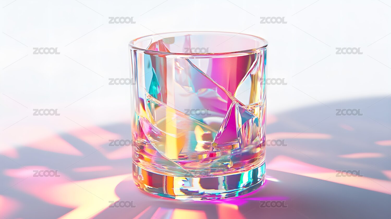彩虹光影下的玻璃杯