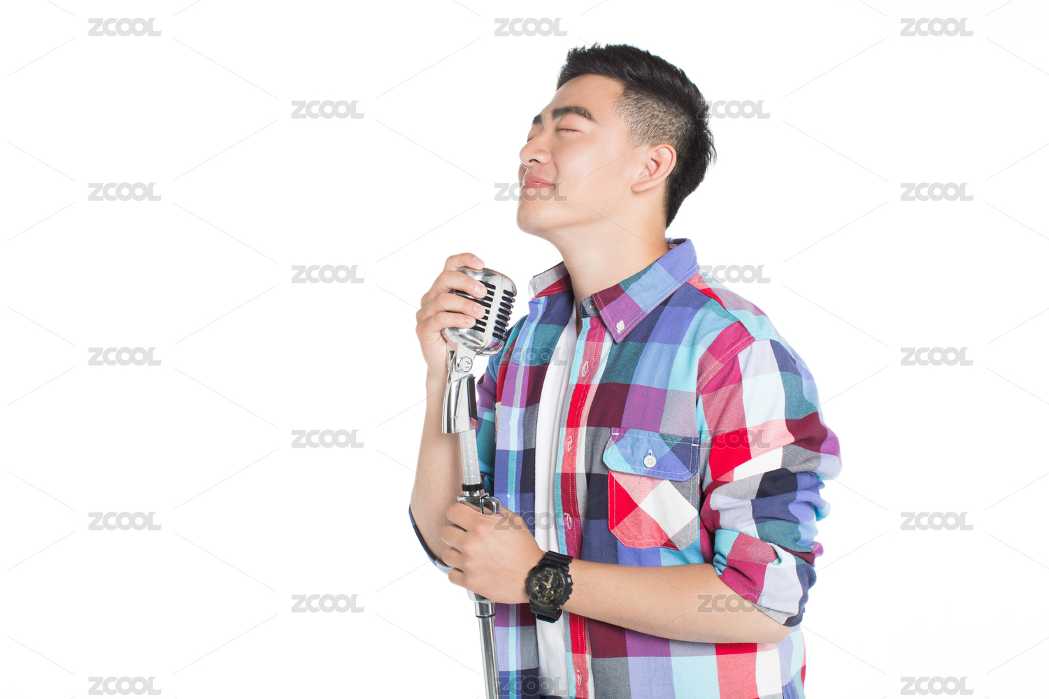 白色背景,帅气男人动作夸张对着麦克风唱歌